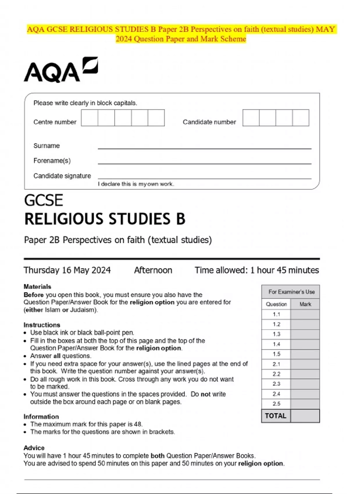 AQA GCSE RELIGIOUS STUDIES B Paper 2B Perspectives on faith (textual studies) MAY 2024 Question Paper and Mark Scheme