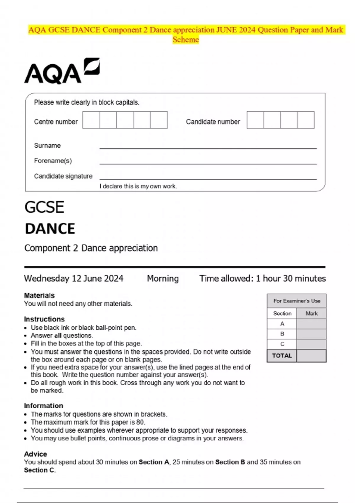 AQA GCSE DANCE Component 2 Dance appreciation JUNE 2024 Question Paper and Mark Scheme