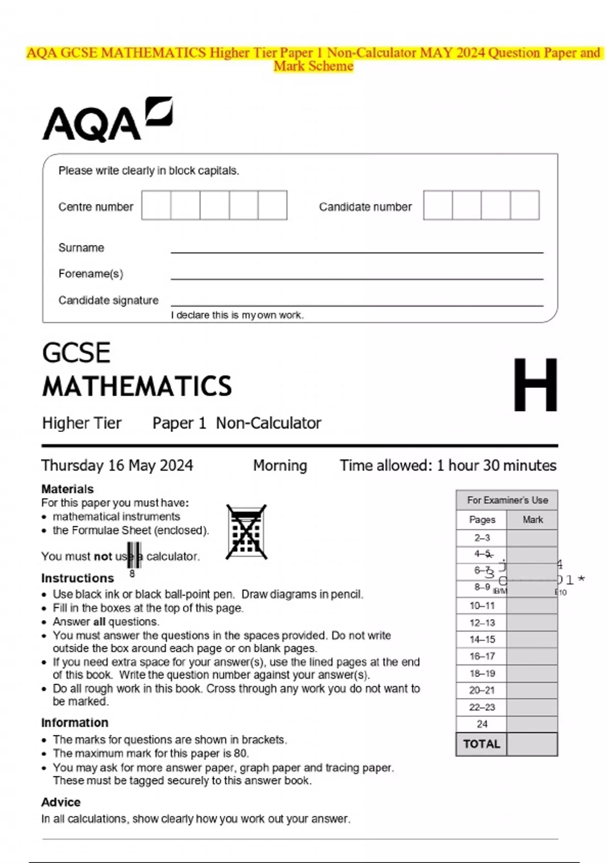 AQA GCSE MATHEMATICS Higher Tier Paper 1 Non-Calculator MAY 2024 Question Paper and Mark Scheme