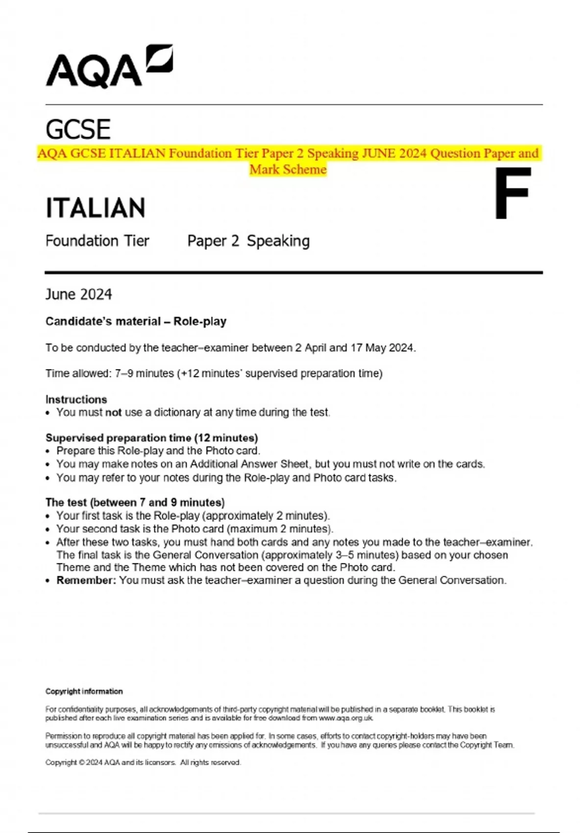 AQA GCSE ITALIAN Foundation Tier Paper 2 Speaking JUNE 2024 Question Paper and Mark Scheme