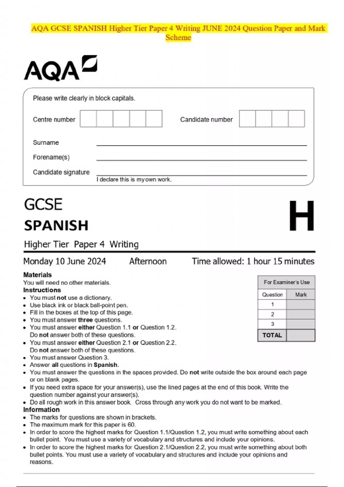 AQA GCSE SPANISH Higher Tier Paper 4 Writing JUNE 2024 Question Paper and Mark Scheme