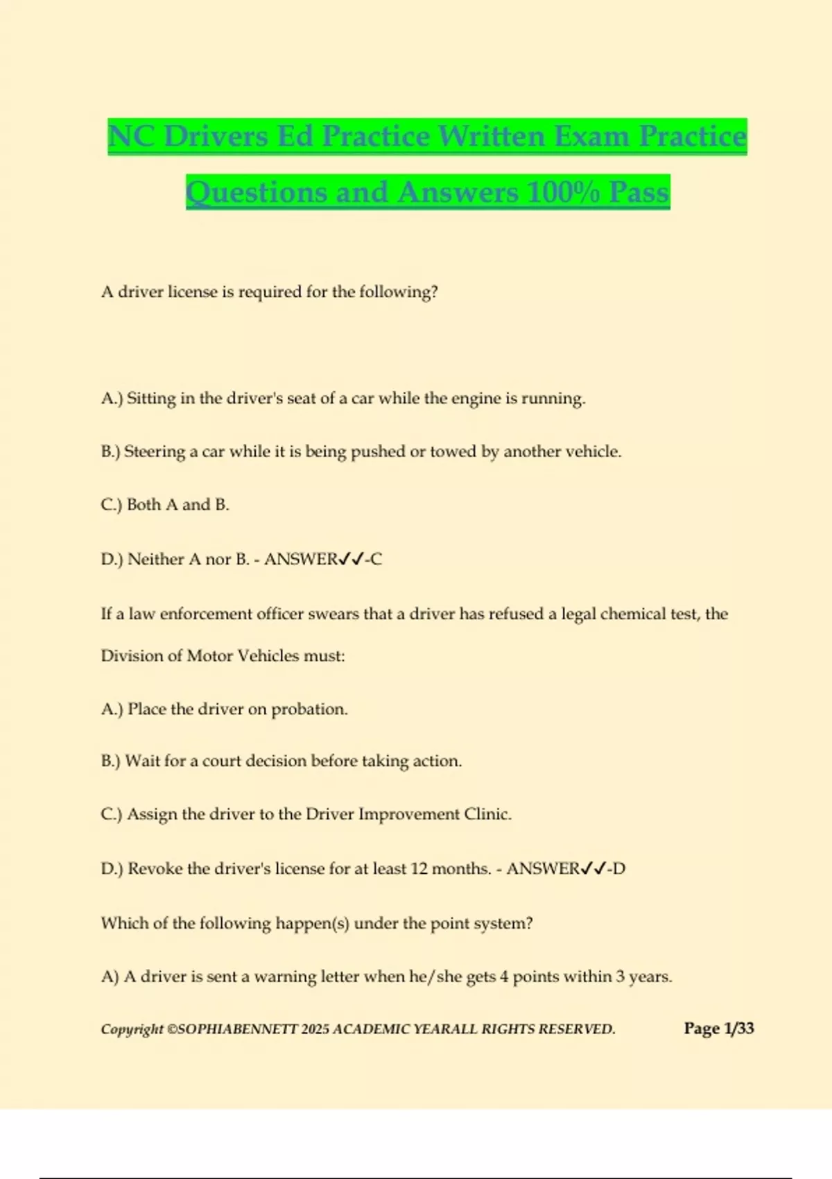 NC Drivers Ed Practice Written Exam Practice Questions and Answers 100% Pass A driver license is required for the following? A.) Sitting in the driver's seat of a car while the engine is running. B.) Steering a car while it is being pushed or towed by another vehicle. C.) Both A and B. D.) Neither A nor B. - ANSWER-C If a law enforcement officer swears that a driver has refused a legal chemical test, the Division of Motor Vehicles must: A.) Place the driver on probation. B.) Wait for a court decision before taking action. C.) Assign the driver to the Driver Improvement Clinic. D.) Revoke the driver's license for at least 12 months. - ANSWER-D Which of the following happen(s) under the point system? A) A driver is sent a warning letter when he/she gets 4 points within 3 years. Copyright ©SOPHIABENNETT 2025 ACADEMIC YEARALL RIGHTS RESERVED. Page 2/33 B) A driver who gets 12 points within 3 years may lose his/her license. C) Both A and B. D) Neither A nor B. - ANSWER-B When a driver has a total of 7 points, which of the following may happen? A) The driver can be required to file proof of financial responsibility. B) The driver can have 3 points deducted if he/she satisfactorily completes a Driver Improvement Clinic. C) Both A and B. D) Neither A nor B. - ANSWER-B 5. Conviction for which of the following carries the highest number of points? A. Reckless driving. B. Hit and run with property damage. C. Driving without a license. D. Passing a stopped school bus unloading children. - ANSWER-D A driver will lose his/her license if he/she is convicted of: A) Driving without a license. B) Passing a stopped school bus. Copyright ©SOPHIABENNETT 2025 ACADEMIC YEARALL RIGHTS RESERVED. Page 3/33 C) Failing to yield the right-of-way. D) Speeding more than 75 mph in a 55mph zone. - ANSWER-D To get a revoked driver license restored, a person must do which of the following? A) Obtain permission from the Driver License Section in Raleigh to reapply for a license. B) Go to a driver license office, pay a restoration fee, and reapply for a license. C) Both A and B. D) Neither A nor B. - ANSWER-C Roughly half of all traffic fatalities involve which of the following? A) A drunken person. B) More than 1 car. C) Both A and B. D) Neither A nor B. - ANSWER-A The percentage of highway deaths caused by drunken persons is about: A) 10% B) 25% C) 50% Copyright ©SOPHIABENNETT 2025 ACADEMIC YEARALL RIGHTS RESERVED. Page 4/33 D) 67% - ANSWER-C Which of the following statements about pedestrian deaths is correct? A) In cities, 2 out of 5 people killed in motor vehicle accidents are pedestrians. B) Most of the pedestrians killed in all traffic accidents are teenagers. C) Both A and B. D) Neither A nor B. - ANSWER-A When you are walking at night along a road without sidewalks, you should do which of the following? A) Walk on the left, facing traffic. B) Keep your back to oncoming traffic. C) Both A and B. D) Neither A nor B. - ANSWER-A If you approach an intersection where there are no traffic lights/signs and a pedestrian is attempting to cross your path, who has the right-of-way? A) The pedestrian. B) The driver of the car. C) No one. Copyright ©SOPHIABENNETT 2025 ACADEMIC YEARALL RIGHTS RESERVED. Page 5/33 D) Whoever reaches the intersection first. - ANSWER-A If you are walking along a road at night, what should you do? A) Walk on the right-hand side with the traffic. B) Wear or carry something white. C) Both A and B. D) Neither A nor B. - ANSWER-B A safe driver does which of the following? A) Watches the side of the road over the hood to stay in line. B)Frequently checks the rear-view and side mirrors. C) Drinks coffee while driving at night to stay alert. D) Keeps 2 car lengths between his/her car and the next car on the expressway. - ANSWER-B As you approach an intersection to make a right turn, you should turn on your right turn signal and do which of the following? A) Steer slightly toward the center of the road to give yourself room to clear the corner. B) Hold your arm straight out the window. C) Both A and B. Copyright ©SOPHIABENNETT 2025 ACADEMIC YEARALL RIGHTS RESERVED. Page 6/33 D) Neither A nor B. - ANSWER-D If you begin to feel sleepy while driving on a long trip, you should do which of the following? A) Open a window or vent to let in fresh air. B) Increase your speed. C) Both A and B. D) Neither A nor B. - ANSWER-A When driving on a long trip, you should: A) Rest your eyes from time to time by rubbing them. B) Avoid looking at any one thing for more than a few seconds. C) Keep your eyes on the center of the road straight ahead. D) Spend as much time looking in your mirrors as you do looking in front of you. - ANSWER-B In order to avoid being hit in the rear by another vehicle, you should do which of the following? A) Drive cautiously and use your brakes often. B) Check your rear-view mirrors often. C) Both A and B. Copyright ©SOPHIABENNETT 2025 ACADEMIC YEARALL RIGHTS RESERVED. Page 7/33 D) Neither A nor B. - ANSWER-B Studies have shown which of the following to be a serious traffic hazard? A) Middle-aged drivers. B) Slow drivers. C) Both A and B. D) Neither A nor B. - ANSWER-B Very slow driving is especially dangerous in which of the following situations? A) Just after passing the crest of a hill. B) Just after rounding a curve. C) Both A and B. D) Neither A nor B. - ANSWER-C Which statement(s) concerning speed limits on the open road in North Carolina is correct? A) Unless otherwise posted, the speed limit for passenger cars and pickup trucks is 65 mph. B) The speed limit for a school activity bus is 35 mph. C) Both A and B. Copyright ©SOPHIABENNETT 2025 ACADEMIC YEARALL RIGHTS RESERVED. Page 8/33 D) Neither A nor B. - ANSWER-D Which of the following statement(s) about speed limits for cars in North Carolina is correct? A)The speed limit outside a city is 55mph unless otherwise posted. B) The speed limit inside a city is 25 mph unless otherwise posted. C) Both A and B. D) Neither A nor B. - ANSWER-A