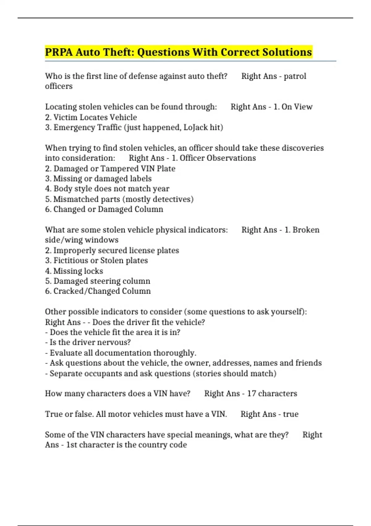 PRPA Auto Theft: Questions With Correct Solutions