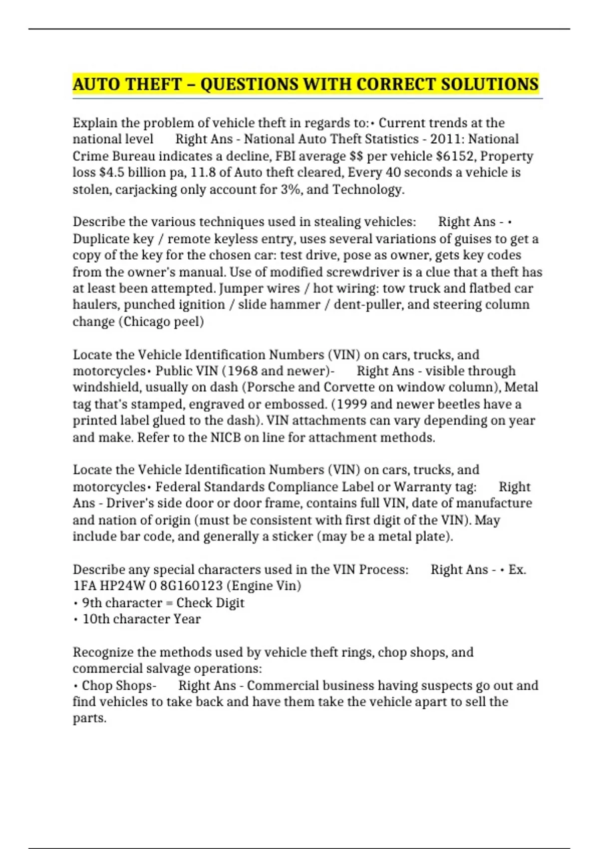 AUTO THEFT – QUESTIONS WITH CORRECT SOLUTIONS