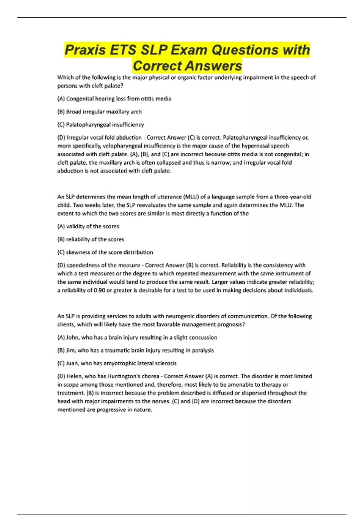Praxis ETS SLP Exam Questions with Correct Answers Which of the following is the major physical or organic factor underlying impairment in the speech of persons with cleft palate? (A) Congenital hearing loss from otitis media (B) Broad irregular maxillary arch (C) Palatopharyngeal insufficiency (D) Irregular vocal fold abduction - Correct Answer (C) is correct. Palatopharyngeal insufficiency or, more specifically, velopharyngeal insufficiency is the major cause of the hypernasal speech associated with cleft palate. (A), (B), and (C) are incorrect because otitis media is not congenital; in cleft palate, the maxillary arch is often collapsed and thus is narrow; and irregular vocal fold abduction is not associated with cleft palate. An SLP determines the mean length of utterance (MLU) of a language sample from a three-year-old child. Two weeks later, the SLP reevaluates the same sample and again determines the MLU. The extent to which the two scores are similar is most directly a function of the (A) validity of the scores (B) reliability of the scores (C) skewness of the score distribution (D) speededness of the measure - Correct Answer (B) is correct. Reliability is the consistency with which a test measures or the degree to which repeated measurement with the same instrument of the same individual would tend to produce the same result. Larger values indicate greater reliability; a reliability of 0.90 or greater is desirable for a test to be used in making decisions about individuals. An SLP is providing services to adults with neurogenic disorders of communication. Of the following clients, which will likely have the most favorable management prognosis? (A) John, who has a brain injury resulting in a slight concussion (B) Jim, who has a traumatic brain injury resulting in paralysis (C) Juan, who has amyotrophic lateral sclerosis (D) Helen, who has Huntington's chorea - Correct Answer (A) is correct. The disorder is most limited in scope among those mentioned and, therefore, most likely to be amenable to therapy or treatment. (B) is incorrect because the problem described is diffused or dispersed throughout the head with major impairments to the nerves. (C) and (D) are incorrect because the disorders mentioned are progressive in nature.