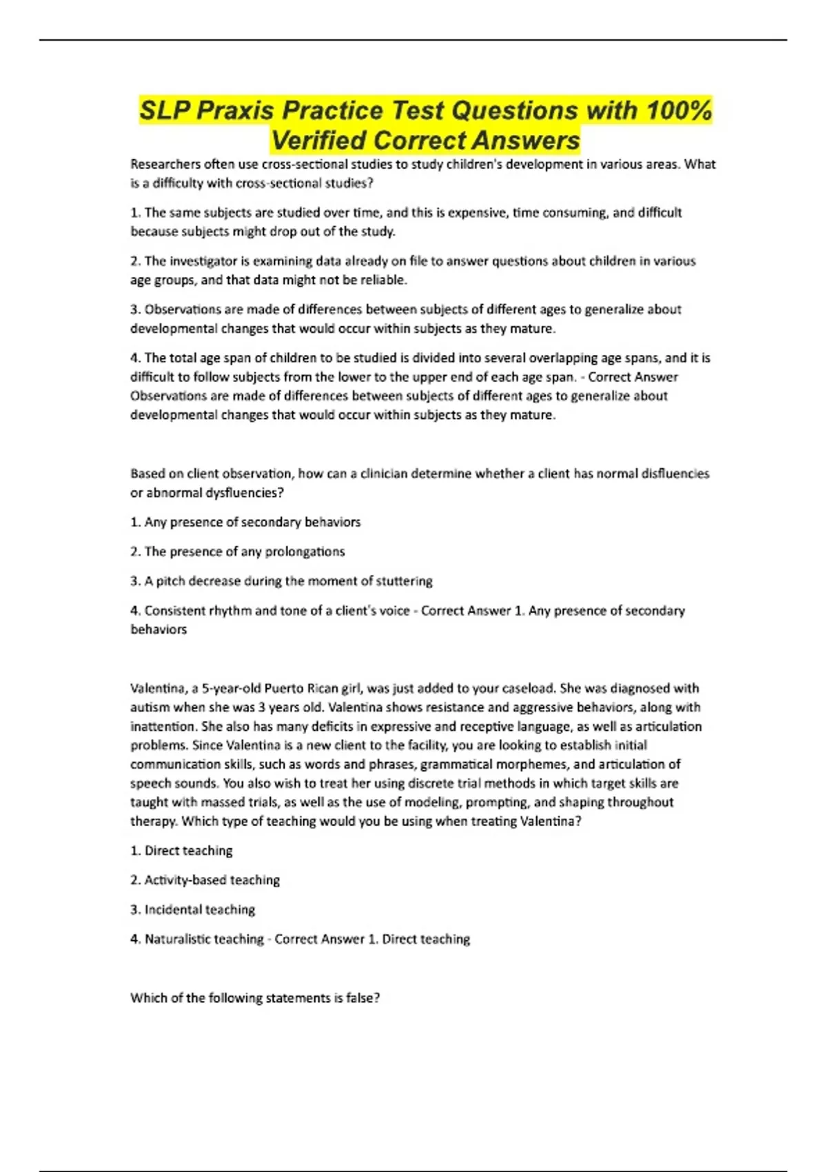 SLP Praxis Practice Test Questions with 100% Verified Correct Answers Researchers often use cross-sectional studies to study children's development in various areas. What is a difficulty with cross-sectional studies? 1. The same subjects are studied over time, and this is expensive, time consuming, and difficult because subjects might drop out of the study. 2. The investigator is examining data already on file to answer questions about children in various age groups, and that data might not be reliable. 3. Observations are made of differences between subjects of different ages to generalize about developmental changes that would occur within subjects as they mature. 4. The total age span of children to be studied is divided into several overlapping age spans, and it is difficult to follow subjects from the lower to the upper end of each age span. - Correct Answer Observations are made of differences between subjects of different ages to generalize about developmental changes that would occur within subjects as they mature. Based on client observation, how can a clinician determine whether a client has normal disfluencies or abnormal dysfluencies? 1. Any presence of secondary behaviors 2. The presence of any prolongations 3. A pitch decrease during the moment of stuttering 4. Consistent rhythm and tone of a client's voice - Correct Answer 1. Any presence of secondary behaviors Valentina, a 5-year-old Puerto Rican girl, was just added to your caseload. She was diagnosed with autism when she was 3 years old. Valentina shows resistance and aggressive behaviors, along with inattention. She also has many deficits in expressive and receptive language, as well as articulation problems. Since Valentina is a new client to the facility, you are looking to establish initial communication skills, such as words and phrases, grammatical morphemes, and articulation of speech sounds. You also wish to treat her using discrete trial methods in which target skills are taught with massed trials, as well as the use of modeling, prompting, and shaping throughout therapy. Which type of teaching would you be using when treating Valentina? 1. Direct teaching 2. Activity-based teaching 3. Incidental teaching 4. Naturalistic teaching - Correct Answer 1. Direct teaching Which of the following statements