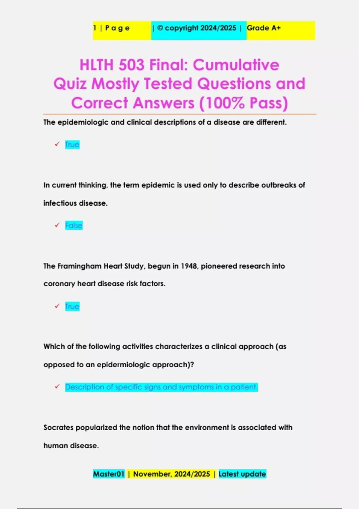 The epidemiologic and clinical descriptions of a disease are different. True In current thinking, the term epidemic is used only to describe outbreaks of infectious disease. False The Framingham Heart Study, begun in 1948, pioneered research into coronary heart disease risk factors. True Which of the following activities characterizes a clinical approach (as opposed to an epidermiologic approach)? Description of specific signs and symptoms in a patient. Socrates popularized the notion that the environment is associated with human disease. Master01 | November, 2024/2025 | Latest update 1 | P a g e | © copyright 2024/2025 | Grade A+ False Most of the time, epidemiologic researchers confront a problem that has a clear etiologic basis. False Which of the following activities characterizes an epidemiologic approach (as opposed to a clinical approach)? Surveillance of a population. John Snow is credited with developing the smallpox vaccination. False Molecular epidemiology applies the techniques of molecular biology to epidemiologic studies. True Environmental and occupational health problems are a specialization of epidemiology. True Master01 | November, 2024/2025 | Latest update 1 | P a g e | © copyright 2024/2025 | Grade A+ The 1918 Influenza Pandemic is also known as "the Mother of All Pandemics." True Cyclic variations in the occurrence of pneumonia and influenza mortality may reflect: Seasonal variation in cases of influenza The study of diseases linked to harmful physical energy, such as ionizing radiation, would be outside the scope of epidemiology. False Indicate the level of preve