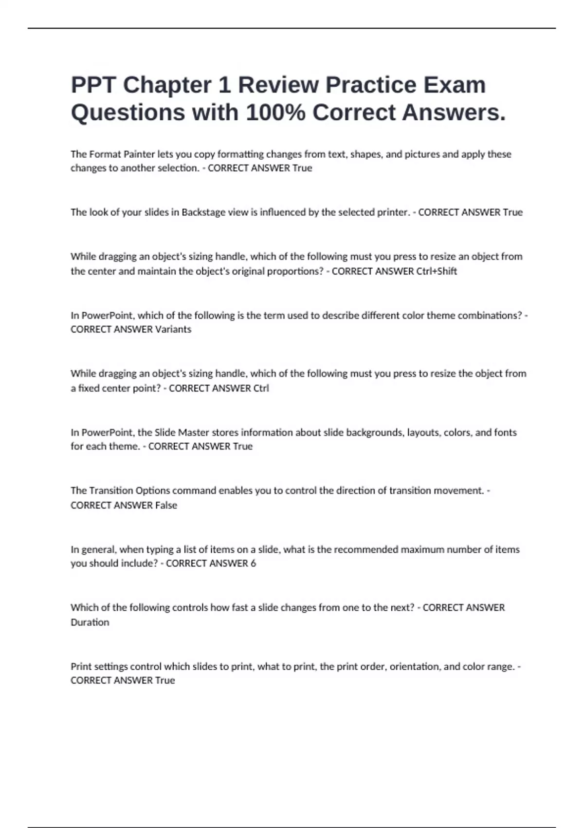 PPT Chapter 1 Review Practice Exam Questions with 100% Correct Answers. The Format Painter lets you copy formatting changes from text, shapes, and pictures and apply these changes to another selection. - CORRECT ANSWER True The look of your slides in Backstage view is influenced by the selected printer. - CORRECT ANSWER True While dragging an object's sizing handle, which of the following must you press to resize an object from the center and maintain the object's original proportions? - CORRECT ANSWER Ctrl+Shift In PowerPoint, which of the following is the term used to describe different color theme combinations? - CORRECT ANSWER Variants While dragging an object's sizing handle, which of the following must you press to resize the object from a fixed center point? - CORRECT ANSWER Ctrl In PowerPoint, the Slide Master stores information about slide backgrounds, layouts, colors, and fonts for each theme. - CORRECT ANSWER True