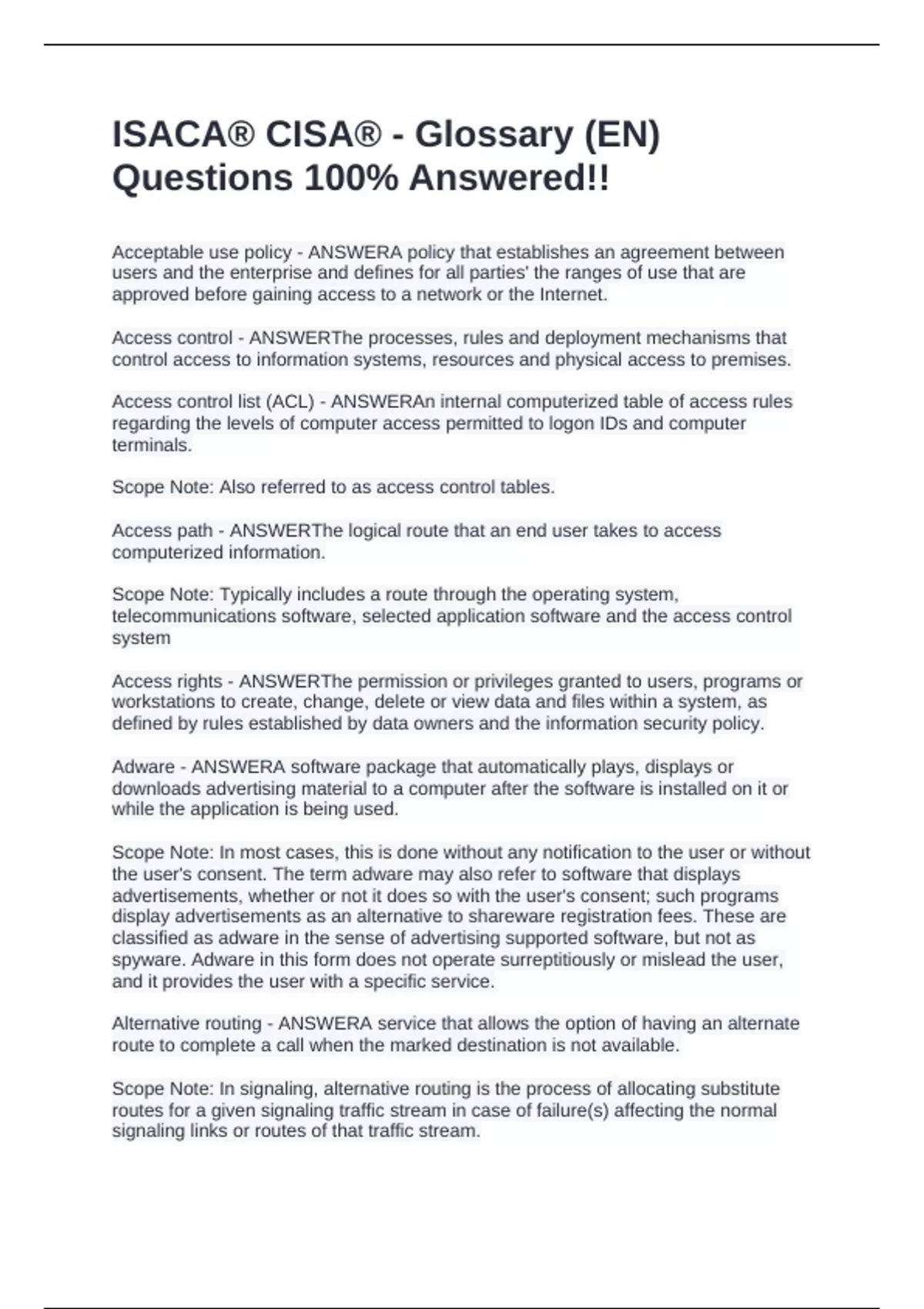 ISACA® CISA® - Glossary (EN) Questions 100% Answered!!