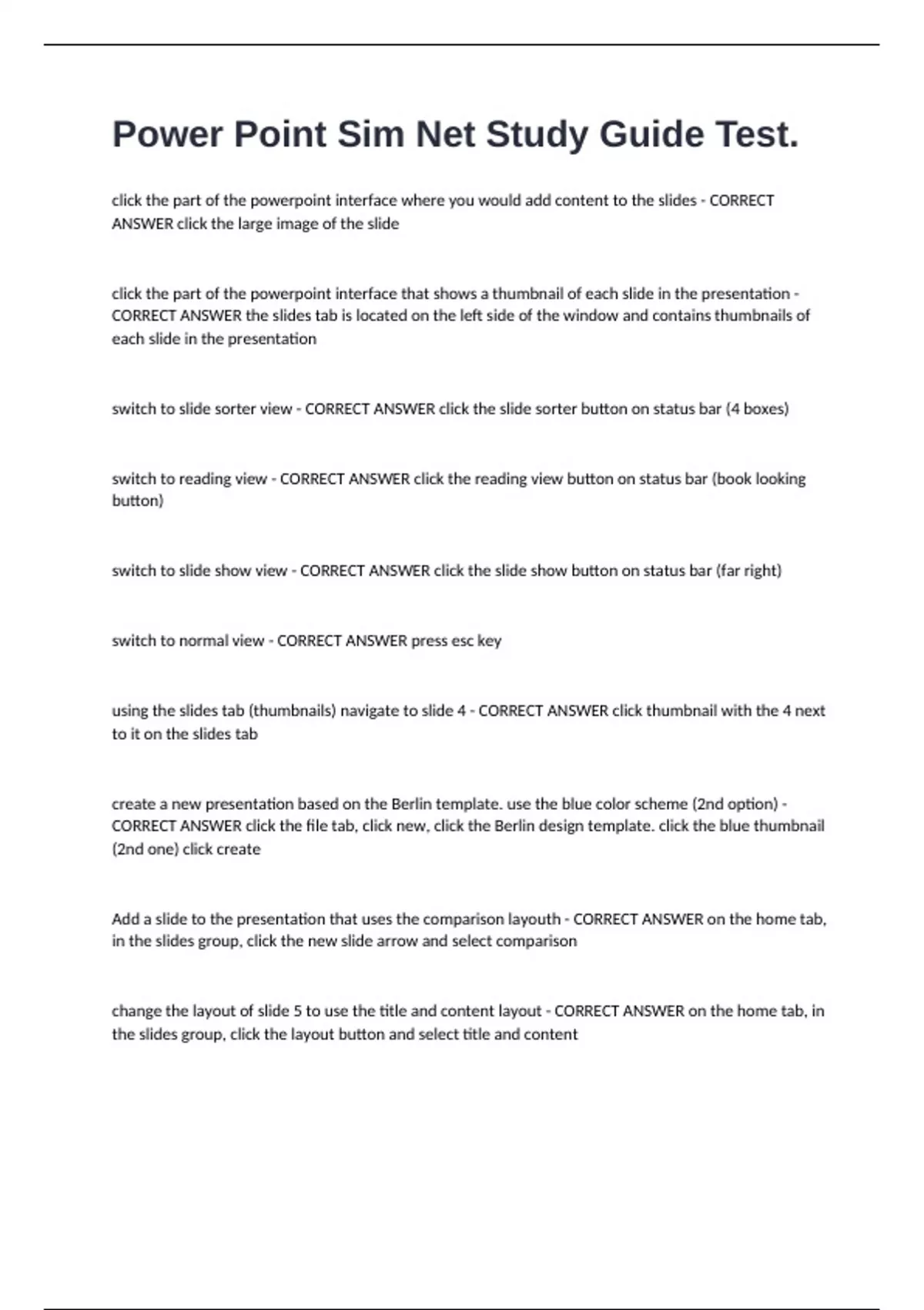 Power Point Sim Net Study Guide Test. click the part of the powerpoint interface where you would add content to the slides - CORRECT ANSWER click the large image of the slide click the part of the powerpoint interface that shows a thumbnail of each slide in the presentation - CORRECT ANSWER the slides tab is located on the left side of the window and contains thumbnails of each slide in the presentation switch to slide sorter view - CORRECT ANSWER click the slide sorter button on status bar (4 boxes) switch to reading view - CORRECT ANSWER click the reading view button on status bar (book looking button) switch to slide show view - CORRECT ANSWER click the slide show button on status bar (far right) switch to normal view - CORRECT ANSWER press esc key using the slides tab (thumbnails) navigate to slide 4 - CORRECT ANSWER click thumbnail with the 4 next to it on the slides tab create a new presentation based on the Berlin template. use the blue color scheme (2nd option) - CORRECT ANSWER click the file tab, click new, click the Berlin design template. click the blue thumbnail (2nd one) click create Add a slide to the presentation that uses the comparison layouth - CORRECT ANSWER on the home tab, in the slides group, click the new slide arrow and select comparison change the layout of slide 5 to use the title and content layout - CORRECT ANSWER on the home tab, in the slides group, click the layout button and select title and content