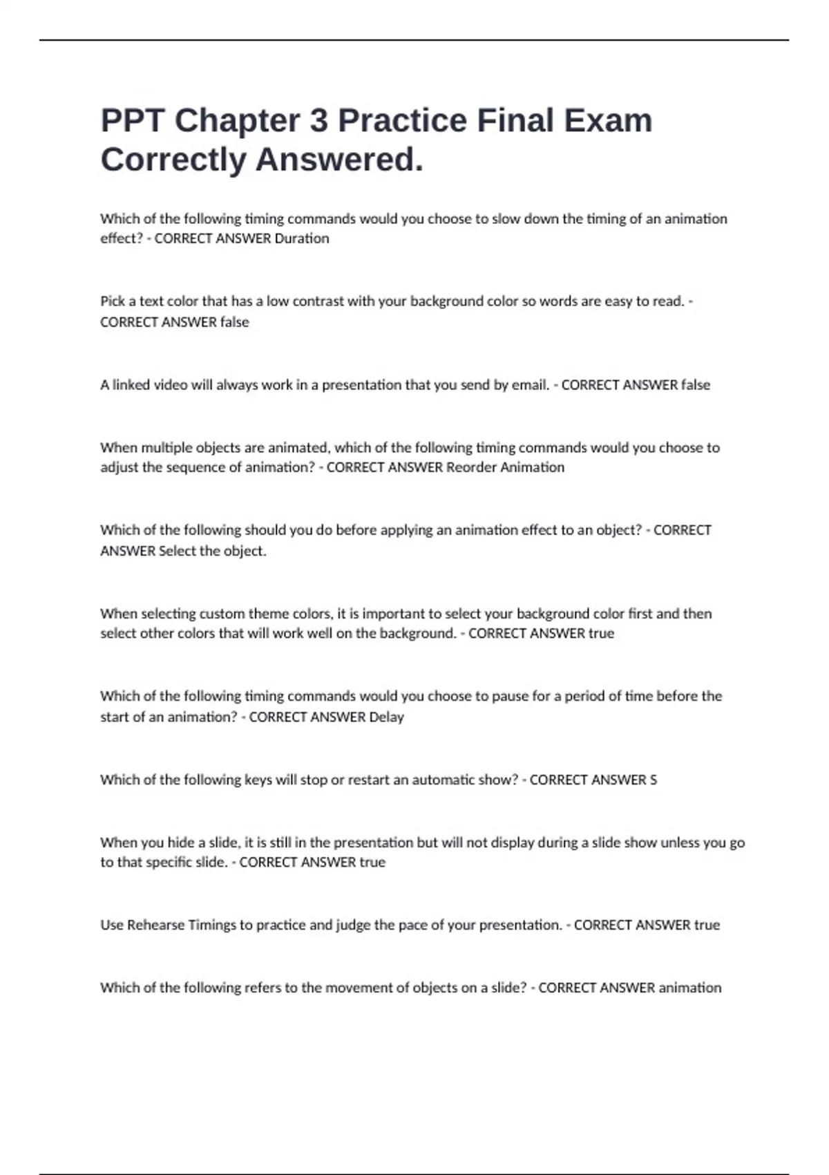 PPT Chapter 3 Practice Final Exam Correctly Answered. Which of the following timing commands would you choose to slow down the timing of an animation effect? - CORRECT ANSWER Duration Pick a text color that has a low contrast with your background color so words are easy to read. - CORRECT ANSWER false A linked video will always work in a presentation that you send by email. - CORRECT ANSWER false When multiple objects are animated, which of the following timing commands would you choose to adjust the sequence of animation? - CORRECT ANSWER Reorder Animation Which of the following should you do before applying an animation effect to an object? - CORRECT ANSWER Select the object. When selecting custom theme colors, it is important to select your background color first and then select other colors that will work well on the background. - CORRECT ANSWER true Which of the following timing commands would you choose to pause for a period of time before the start of an animation? - CORRECT ANSWER Delay