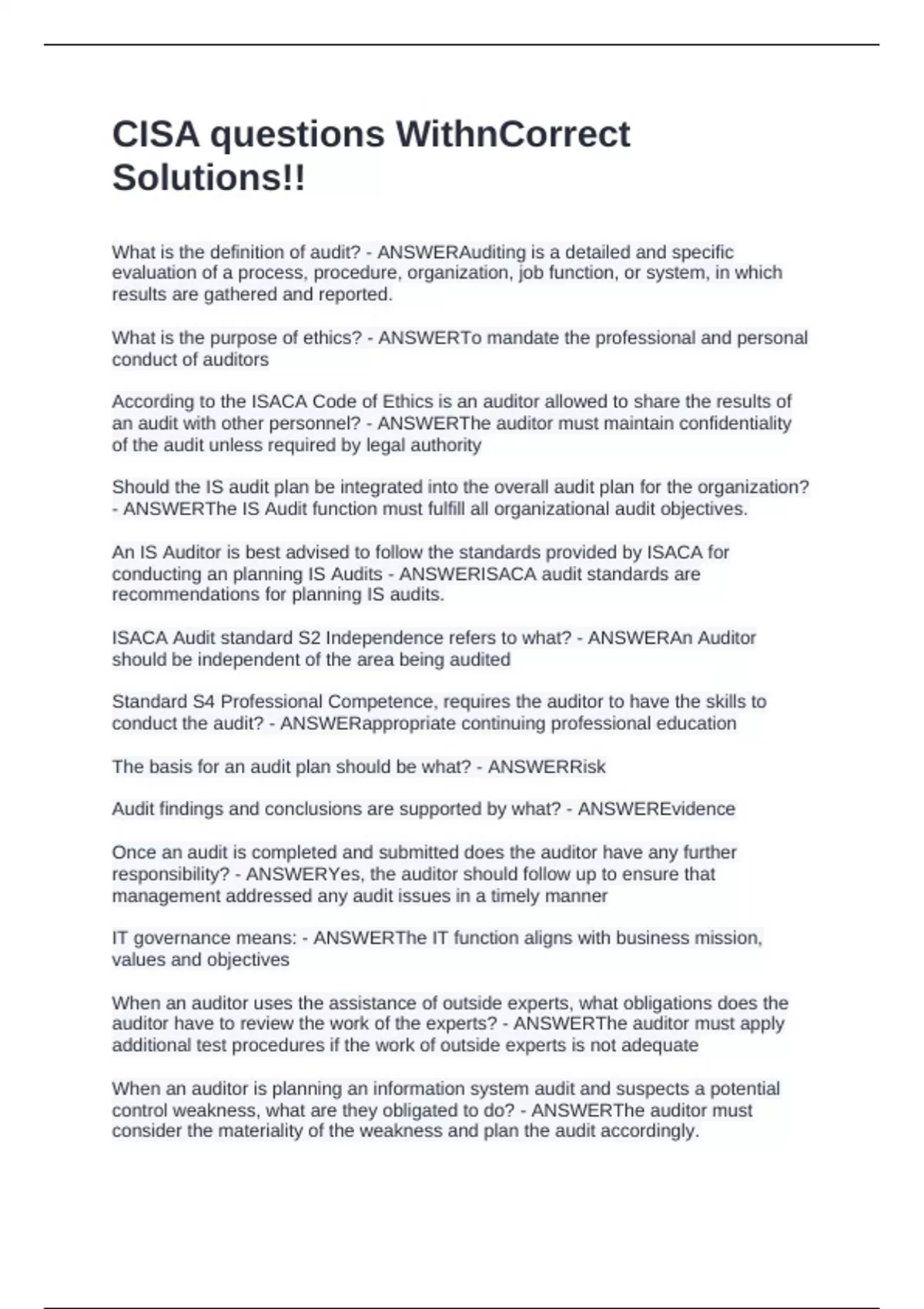 What is the definition of audit? - ANSWERAuditing is a detailed and specific evaluation of a process, procedure, organization, job function, or system, in which results are gathered and reported. What is the purpose of ethics? - ANSWERTo mandate the professional and personal conduct of auditors According to the ISACA Code of Ethics is an auditor allowed to share the results of an audit with other personnel? - ANSWERThe auditor must maintain confidentiality of the audit unless required by legal authority Should the IS audit plan be integrated into the overall audit plan for the organization? - ANSWERThe IS Audit function must fulfill all organizational audit objectives. An IS Auditor is best advised to follow the standards provided by ISACA for conducting an planning IS Audits - ANSWERISACA audit standards are recommendations for planning IS audits. ISACA Audit standard S2 Independence refers to what? - ANSWERAn Auditor should be independent of the area being audited Standard S4 Professional Competence, requires the auditor to have the skills to conduct the audit? - ANSWERappropriate continuing professional education The basis for an audit plan should be what? - ANSWERRisk Audit findings and conclusions are supported by what? - ANSWEREvidence Once an audit is completed and submitted does the auditor have any further responsibility? - ANSWERYes, the auditor should follow up to ensure that management addressed any audit issues in a timely manner IT governance means: - ANSWERThe IT function aligns with business mission, values and objectives When an auditor uses the assistance of outside experts, what obligations does the auditor have to review the work of the experts? - ANSWERThe auditor must apply additional test procedures if the work of outside experts is not adequate When an auditor is planning an information system audit and suspects a potential control weakness, what are they obligated to do? - ANSWERThe auditor must consider the materiality of the weakness and plan the audit accordingly.