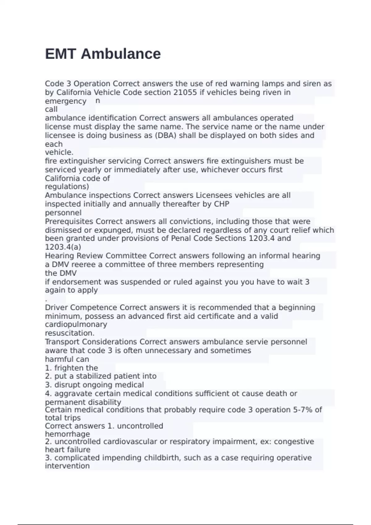 Code 3 Operation Correct answers the use of red warning lamps and siren as permitted by California Vehicle Code section 21055 if vehicles being riven in response to an emergency call ambulance identification Correct answers all ambulances operated under a single license must display the same name. The service name or the name under which the licensee is doing business as (DBA) shall be displayed on both sides and the rear of each vehicle. fire extinguisher servicing Correct answers fire extinguishers must be inspected and serviced yearly or immediately after use, whichever occurs first (Section 597.1 California code of regulations) Ambulance inspections Correct answers Licensees vehicles are all required to be inspected initially and annually thereafter by CHP personnel Prerequisites Correct answers all convictions, including those that were set aside, dismissed or expunged, must be declared regardless of any court relief which may have been granted under provisions of Penal Code Sections 1203.4 and 1203.4(a) Hearing Review Committee Correct answers following an informal hearing conducted by a DMV reeree a committee of three members representing the DMV if endorsement was suspended or ruled against you you have to wait 3 years to apply again. Driver Competence Correct answers it is recommended that a beginning driver, as a minimum, possess an advanced first aid certificate and a valid certificate in cardiopulmonary resuscitation. Transport Considerations Correct answers ambulance servie personnel should be aware that code 3 is often unnecessary and sometimes harmful can 1. frighten the patient 2. put a stabilized patient into shock 3. disrupt ongoing medical treatment 4. aggravate certain medical conditions sufficient ot cause death or permanent disability Certain medical conditions that probably require code 3 operation 5-7% of total trips Correct answers 1. uncontrolled hemorrhage 2. uncontrolled cardiovascular or respiratory impairment, ex:
