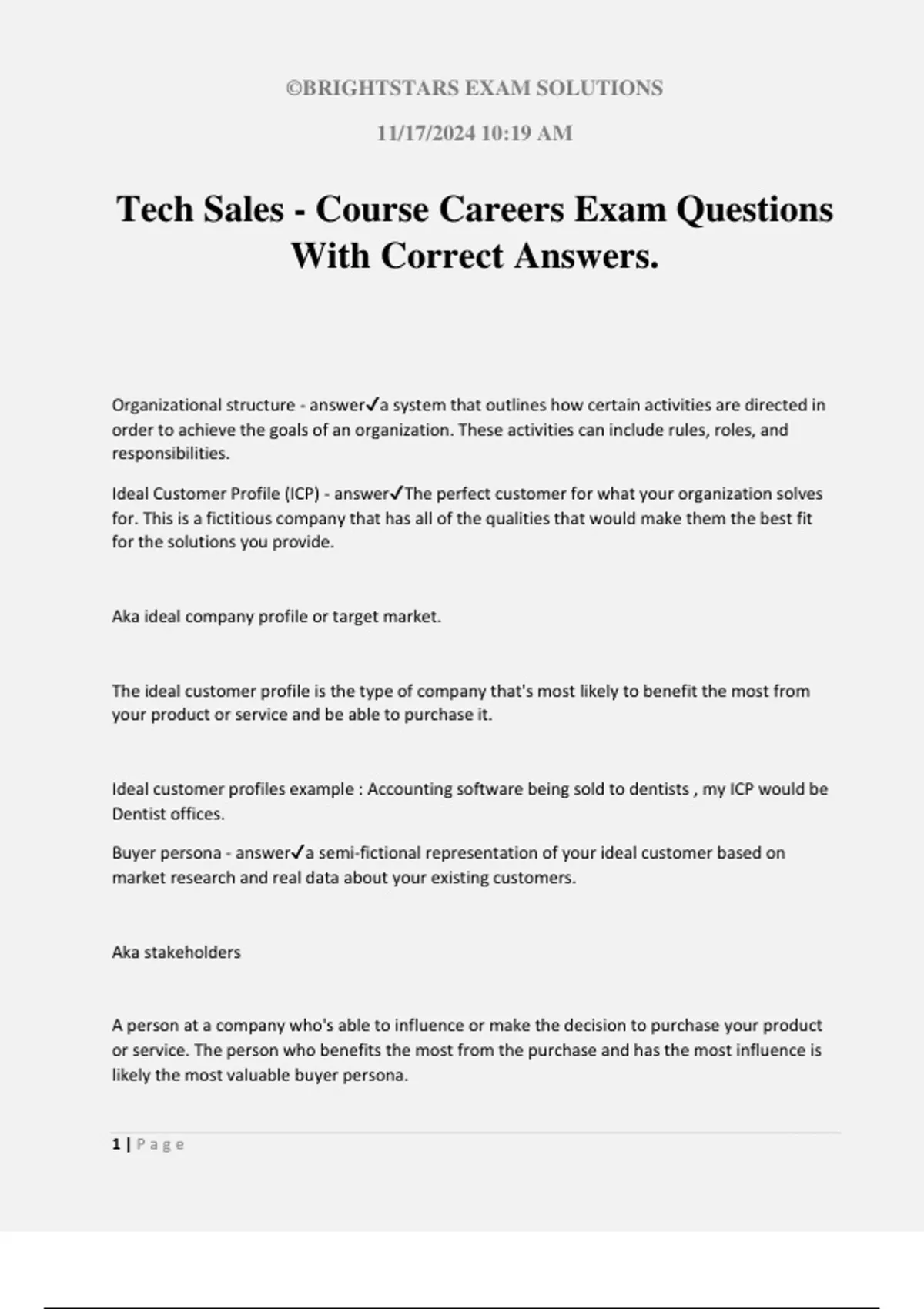 ©BRIGHTSTARS EXAM SOLUTIONS 11/17/2024 10:19 AM 1 | P a g e Tech Sales - Course Careers Exam Questions With Correct Answers. Organizational structure - answera system that outlines how certain activities are directed in order to achieve the goals of an organization. These activities can include rules, roles, and responsibilities. Ideal Customer Profile (ICP) - answerThe perfect customer for what your organization solves for. This is a fictitious company that has all of the qualities that would make them the best fit for the solutions you provide. Aka ideal company profile or target market. The ideal customer profile is the type of company that's most likely to benefit the most from your product or service and be able to purchase it. Ideal customer profiles example : Accounting software being sold to dentists , my ICP would be Dentist offices. Buyer persona - answera semi-fictional representation of your ideal customer based on market research and real data about your existing customers. Aka stakeholders A person at a company who's able to influence or make the decision to purchase your product or service. The person who benefits the most from the purchase and has the most influence is likely the most valuable buyer persona. ©BRIGHTSTARS EXAM SOLUTIONS 11/17/2024 10:19 AM 2 | P a g e Buyer persona are the people at those companies. B2B (business-to-business) - answerthe process of selling merchandise or services from one business to another B2C - answerthe process in which businesses sell to consumers Champion - answerA prospect within a company that wants to purchase your product or service and is willing to do everything they can to help convince the others in the company to make the purchase. Channel partner - answerA person or company that offers services or products on behalf of another company. Channel Sales - answerFocusing on different sales channels, such as an in-house sales team, retailers, referrals, dealers etc. Churn - answerthe number of consumers who stop using a product or service, divided by the average number of consumers of that product or service Closing Ratio - answerA closing ratio is the number of deals closed compared to the number of engaged prospects. This ratio can be used to evaluate the performance of an individual sales rep and forecast sales. clients - answerClosed opportunities, paying clients and people that your account managers should take care of. Closers - answerOr Account Executives, they are focused on closing deals and they only prospect a small number of strategic accounts. Cold call - answerAttempt to engage with a prospect (that you don't yet have a relationship established) on a call. Cold email - answerAttempt to engage with prospects via email; sending a sales proposal to someone that you don't yet have a relationship with. Customer Acquisition Cost (CAC) - answerThe cost of acquiring new paying clients Customer Relationship Management (CRM) - answerA software or Internet-based service that helps business owners and sales professionals manage their sales pipeline; track prospects and related activities throughout the sales cycle.