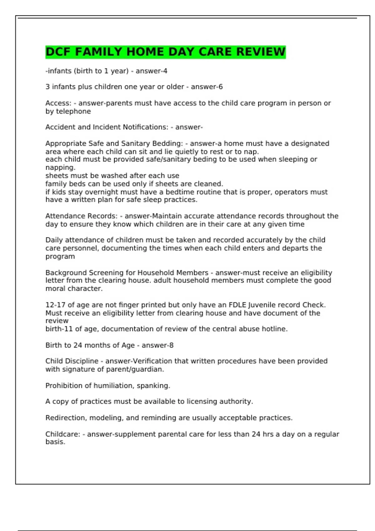 -infants (birth to 1 year) - answer-4 3 infants plus children one year or older - answer-6 Access: - answer-parents must have access to the child care program in person or by telephone Accident and Incident Notifications: - answer- Appropriate Safe and Sanitary Bedding: - answer-a home must have a designated area where each child can sit and lie quietly to rest or to nap. each child must be provided safe/sanitary beding to be used when sleeping or napping. sheets must be washed after each use family beds can be used only if sheets are cleaned. if kids stay overnight must have a bedtime routine that is proper, operators must have a written plan for safe sleep practices. Attendance Records: - answer-Maintain accurate attendance records throughout the day to ensure they know which children are in their care at any given time Daily attendance of children must be taken and recorded accurately by the child care personnel, documenting the times when each child enters and departs the program Background Screening for Household Members - answer-must receive an eligibility letter from the clearing house. adult household members must complete the good moral character. 12-17 of age are not finger printed but only have an FDLE Juvenile record Check. Must receive an eligibility letter from clearing house and have document of the review birth-11 of age, documentation of review of the central abuse hotline. Birth to 24 months of Age - answer-8 Child Discipline - answer-Verification that written procedures have been provided with signature of parent/guardian. Prohibition of humiliation, spanking. A copy of practices must be available to licensing authority. Redirection, modeling, and reminding are usually acceptable practices. Childcare: - answer-supplement parental care for less than 24 hrs a day on a regular basis. Main Types Of A Child Care: -Child care facilities -Large family -Family Day Care -Specialized for Midly Ill Enrollment Records - answer-must be on file and contain critical information about the child to protect their safety. When enrolled following statements must be signed: department of selecting a family day care home brochure. written disciplinary and expulsion form FLU information, annually during August & September Food and Nutrition policy that include language of food safety and allergens. Family Day Care Home - answer-An occupied residence in which child care in regularly provided for child from at least 2 unrelated families and receive a form of payment. Family day care is how many children? - answer-6 children 3 infants, 3 children.. one year or older First Aid Kit & Emergency Telephone numbers - answer-liquid soap/hand sanitizer adhesive bandages disposable gloves cotton ball or applicatiors sterile gauzed, pads or rolls. adhesive tape digital thermometers tweezers scissors bottle water pre-moisten wipes resource guide for CPR.firstaid Food Handling: - answer-child care programs must wash, rinse and sanitize bottles and sippy cups between each use, they must be labeled with the first and last name. do not allow milk to sit out for longer than 15. refrigerate bottles ASAP and use them within 24 hours. water should be accessible throughout the day child care personnel must following handling guidelines to protect children from illnesses and contaminated food. Food Safety - answer-Food safety is how food is handled to prevent foodborne illness. SANITARY AT ALL TIMES. infants cut in 1/4 toddlers cut in 1/2 children younger than 4 months may not be feed solids avoid hot dogs, grapes, nuts, popcorn. have a food allergy written plan that includes instructions. during field trips be sure that the supplies needed are there. operators must notify the parents immediately if a food allergy incident occurs and contacts emergency medical services General Supervision: - answer-direct and active supervision daily Gold Seal Quality Care Program - answer-recognizes child care facilities, large family child care homes, and family day care homes that have been accredited by an approved accrediting association. Must NOT Have: -any class 1 violations -3 or more class 2 of the same licensing standard -citation for the same class 3 violation 3 or more times and fail to correct the problem within the past year. Health and Safety Requirements: - answer-all child care programs must be clean, in good repair and free from health and safety hazards. caregivers must inspect indoor and outdoor for health and safety hazards. documentation of testing detectors must be maintained for the licensing authority to review. immunization record - answer-record that maintains a list of immunizations that a child has received and often indicates when additional immunizations will be required.. Each child enrolled, except for school age children must have documentation of immunizations or exemptions from immunizations on file with the child care program. If the parent fails to provide the require documentation within 30 days of enrollment, child should be excluded from care. Indoor Equipment and Environment: - answer-all areas must be in good repair, clean and free of litters, nails, glass and other hazards. homes must have a written routine schedule, for cleaning, sanitizing, and disinfecting equipment, materials, furnishing and play area. all equipment should be sturdy, safe and in good repair. all child care programs must make toys and equipment DAP. INSIDE TEMP is 62-82 Infant feeding and Food: - answer-formula and breastmilk must be stored, prepared and discarded properly. child care programs cannot accept previous opened jars. programs must develop and follow procedures for the prep and the storage of exposed breast milk. microwaves cannot be used to heat bottles. always test heat the bottles and food before feeding to prevent injuries to child formula and breastmilk should be served at body temp. Initial Background Screening - answer-background screening is conducted to ensure operations, household members, substitu