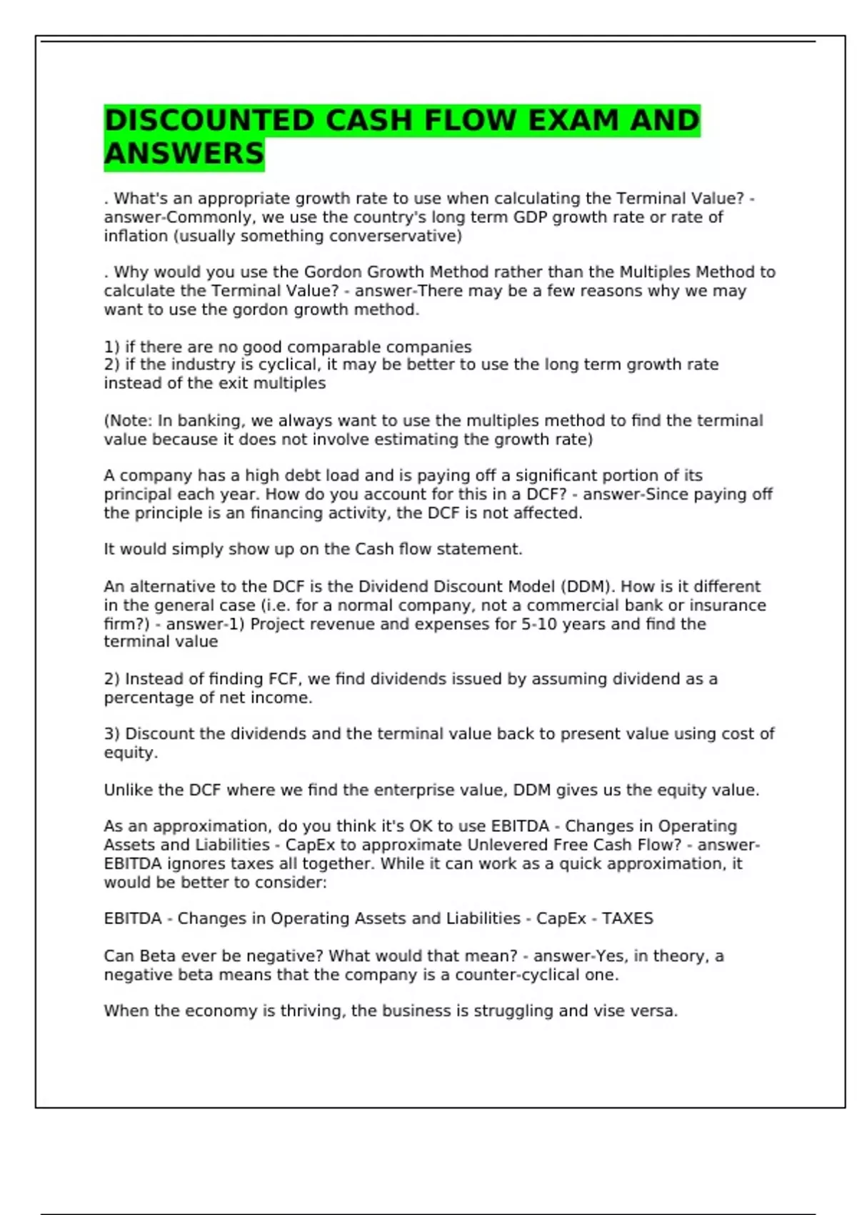 . What's an appropriate growth rate to use when calculating the Terminal Value? - answer-Commonly, we use the country's long term GDP growth rate or rate of inflation (usually something converservative) . Why would you use the Gordon Growth Method rather than the Multiples Method to calculate the Terminal Value? - answer-There may be a few reasons why we may want to use the gordon growth method. 1) if there are no good comparable companies 2) if the industry is cyclical, it may be better to use the long term growth rate instead of the exit multiples (Note: In banking, we always want to use the multiples method to find the terminal value because it does not involve estimating the growth rate) A company has a high debt load and is paying off a significant portion of its principal each year. How do you account for this in a DCF? - answer-Since paying off the principle is an financing activity, the DCF is not affected. It would simply show up on the Cash flow statement. An alternative to the DCF is the Dividend Discount Model (DDM). How is it different in the general case (i.e. for a normal company, not a commercial bank or insurance firm?) - answer-1) Project revenue and expenses for 5-10 years and find the terminal value 2) Instead of finding FCF, we find dividends issued by assuming dividend as a percentage of net income. 3) Discount the dividends and the terminal value back to present value using cost of equity. Unlike the DCF where we find the enterprise value, DDM gives us the equity value. As an approximation, do you think it's OK to use EBITDA - Changes in Operating Assets and Liabilities - CapEx to approximate Unlevered Free Cash Flow? - answer-EBITDA ignores taxes all together. While it can work as a quick approximation, it would be better to consider: EBITDA - Changes in Operating Assets and Liabilities - CapEx - TAXES Can Beta ever be negative? What would that mean? - answer-Yes, in theory, a negative beta means that the company is a counter-cyclical one. When the economy is thriving, the business is struggling and vise versa. Compare cost of equity of firms in emerging and fast-growing geographies and markets to those in stable markets? - answer-cost of equity of firms in emerging and fast-growing geographies and markets will be higher Comparing smaller and bigger companies, who have a higher cost of equity? - answer-Smaller companies - more risky - higher return Cost of Equity tells us the return that an equity investor might expect for investing in a given company - but what about dividends? Shouldn't we factor dividend yield into the formula under CAPM? - answer-1) rE = rU + (rU-rd)BLev BLev = Bunlev*(1+(1-t)(1+D/E) Dividend yield is already considered in Beta. Beta describes the return in excess of the market, which includes the dividend yield. For unlevered free cash flows, what discount rate should we use? - answer-Wacc, because we care about all parts of the company's capital structure and we want to find the value to all investors How can you check whether your assumptions for Terminal Value using the Multiples Method vs. the Gordon Growth Method make sense? - answer-One way we can check if our assumptions for the terminal value is to calculate the terminal value using one method and then check what the implied long term growth rate is with the other method. For instance, with an How do we find the terminal value? - answer-Terminal Value = Final Year Free Cash Flow * (1 + Terminal FCF Growth Rate) / (Discount Rate - Terminal FCF Growth Rate). How do you calculate Beta in the Cost of Equity calculation? - answer-1) for a set of public comps, we need to find the levered beta for each company. Unlever it and find the mediam unlevered beta. Then we lever the unlevered based on the company's captial structure. How do you calculate WACC for a private company? - answer-Since private companies don't have market caps or betas, we would rely on the WACC down by auditors or estimate based on what the WACC is for similar public companies. How do you calculate WACC? - answer-WACC = Cost of Equity * (% Equity) + Cost of Debt * (% Debt) * (1 - Tax Rate) + Cost of Preferred * (% Preferred) How do you determine a firm's Optimal Capital Structure? What does it mean? - answer-To maximize the value of the firm, we need to find a combination of capital structure that Min WACC. This will often be when the marginal benefit of the tax saving = to the marginal cost of bankruptcy or financial distress. The min wacc depends on the company, the industry, and the market. How do you know if a DCF is too dependent on future assumptions? - answer-There isn't one perfect rule, but if the terminal value accounts for over 90% of the company's value, then maybe the DCF is too depend on our future assumptions. How do you select the appropriate exit multiple when calculating Terminal Value? - answer-We can select the appropriate exit multiple by looking at public comps and picking the median of the set. We always want to show a range of the exit multiples and what the terminal value looks like over that range instead of picking 1 number. (Ex: if the median EBITDA multiple of the set is 8x, then we may want to show a range of 6x-10x) How do you treat Preferred Stock in the formulas above for Beta? - answer-Since preferred dividends are not tax-deductible, it is considered as equity. If a firm is losing money, do you still multiply the Cost of Debt by (1 - Tax Rate) in the WACC formula? How can a tax shield exist if they're not even paying taxes? - answer-In practice, we would still multiple it by (1-t). What is important is not if debt is currently giving the firm a tax-saving, but there is a possible potential for that to occur in the future. If I'm working with a public company in a DCF, how do I move from Enterprise Value to its Implied per Share Value? - answer-1) Find the equity value = Enterprise value + cash & cash equivalent - debt - preferred stock - noncontrolling interest 2) Find the per share pric