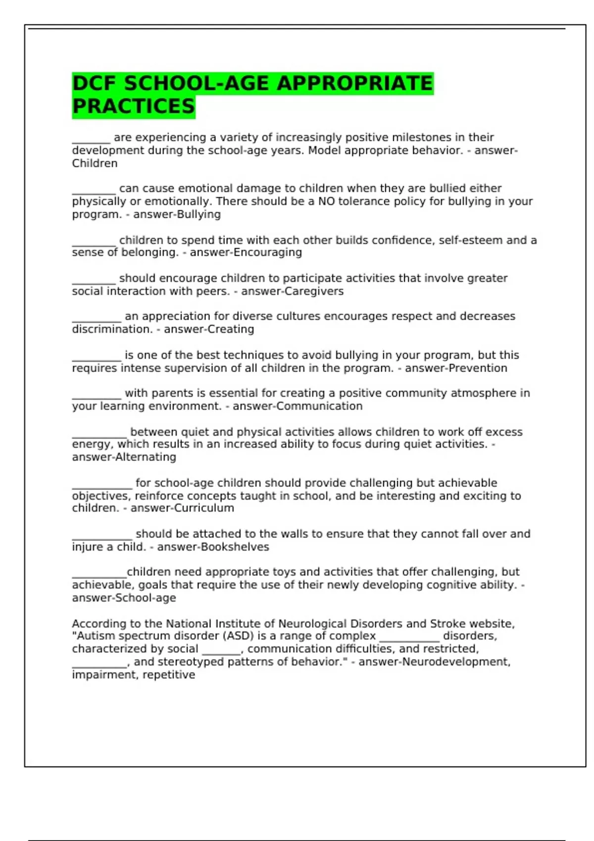 _______ are experiencing a variety of increasingly positive milestones in their development during the school-age years. Model appropriate behavior. - answer-Children ________ can cause emotional damage to children when they are bullied either physically or emotionally. There should be a NO tolerance policy for bullying in your program. - answer-Bullying ________ children to spend time with each other builds confidence, self-esteem and a sense of belonging. - answer-Encouraging ________ should encourage children to participate activities that involve greater social interaction with peers. - answer-Caregivers _________ an appreciation for diverse cultures encourages respect and decreases discrimination. - answer-Creating _________ is one of the best techniques to avoid bullying in your program, but this requires intense supervision of all children in the program. - answer-Prevention _________ with parents is essential for creating a positive community atmosphere in your learning environment. - answer-Communication __________ between quiet and physical activities allows children to work off excess energy, which results in an increased ability to focus during quiet activities. - answer-Alternating ___________ for school-age children should provide challenging but achievable objectives, reinforce concepts taught in school, and be interesting and exciting to children. - answer-Curriculum ___________ should be attached to the walls to ensure that they cannot fall over and injure a child. - answer-Bookshelves __________children need appropriate toys and activities that offer challenging, but achievable, goals that require the use of their newly developing cognitive ability. - answer-School-age According to the National Institute of Neurological Disorders and Stroke website, "Autism spectrum disorder (ASD) is a range of complex ___________ disorders, characterized by social _______, communication difficulties, and restricted, __________, and stereotyped patterns of behavior." - answer-Neurodevelopment, impairment, repetitive As a caregiver, it is essential to be familiar with the __________ and curriculum that children are experiencing in school in order to reinforce those concepts in your learning environment. - answer-concepts Associative play - answer-children play together with materials & some talking (3-5yrs) Autonomy VS Shame and Doubt - answer-When autonomy is allowed a person can become comfortable with his/her choices. Challenging to their cognitive & physical abilities: - answer-Magnetic toys, science kits, Engineering/construction kits, Computers with appropriate software, puzzle games, carpentry kits Children ages 7-9 are _____ to cope with competitives situations. - answer-able Children begin to learn the purpose and function of newly acquired knowledge by participating in learning experiences that help them build connections between what two things? - answer-Idea and Concept Children must be comfortable in order to ___________ in, and benefit from learning activities. This requires furniture that is appropriately sized for children in your care. - answer-participate Close relationships between children and caregivers result in _____ social skills and academic achievement. Positive social interactions and academic achievement result in good behavior. - answer-good Communications with families: - answer-activities learned, behavior, mood, homework details, eating habits, upcoming events, reminders Cooperative play - answer-children play together by planning and working toward a common goal (5yrs-adolescence) Creating _________ opportunities for learning ensures that children stay motivated and enthusiastic. - answer-exciting Creating Curriculum should include 4 things... - answer-curriculum should be challenging, achievable, reinforce concepts and be interesting. Describe a safe learning environment - answer-exits clearly marked and free of clutter, no blindspots, allow foot traffic to flow easily. Describe some ways to prevent and deal with difficult behaviors: - answer-offer constant positive reinforcement, maintain a positive attitude. Developmental alerts - answer-Not growing or gaining weight over the course of the year. Unable to learn alphabet. Unable to find words that rhyme. Can not hold a pencil or form letters. Has a very limited vocabulary/ does not speak often. Does not laugh at jokes/seldom appears happy. Unable to follow directions. Developmental Domains: Approaches to Learning - answer-Child needs a variety of learning materials to stay focused. Developmental Domains: Cognitive Development and General Knowledge - answer-Child develops their sense of independence by experiencing both successes and failures. Developmental Domains: Language and Communications - answer-Child begins to read independently Developmental Domains: Physical - answer-Child begins to run faster, jump higher Developmental Domains: Social and Emotional - answer-Child begins to show respect and empathy other people. Do not feel ________ to adhere to a strict schedule. Flexibility is the key to creating a relaxed environment in which children are allowed time to accomplish their goals. - answer-preessure Down Syndrome is caused by the presence of all or part of an extra what chromosome? - answer-21st Dr. David P. Weikart based this approach to active learning on the theories of who? - answer-Piaget Games and activities for school-age children: - answer-spelling bee, word searches, crossword puzzles, reading challenges, dice games, quiz or trivia, educational software games. How to ensure a safe playground environment: - answer-be alert and attentive, encourage appropriate use of high energy, redirect rowdy children. Identify some ways to create positive interactions between everyone in the learning environment: - answer-Be warm and friendly and caring, get to know children, learn their likes and dislikes, provide accommodations for special needs. Identify the positive milestones that school-age chil