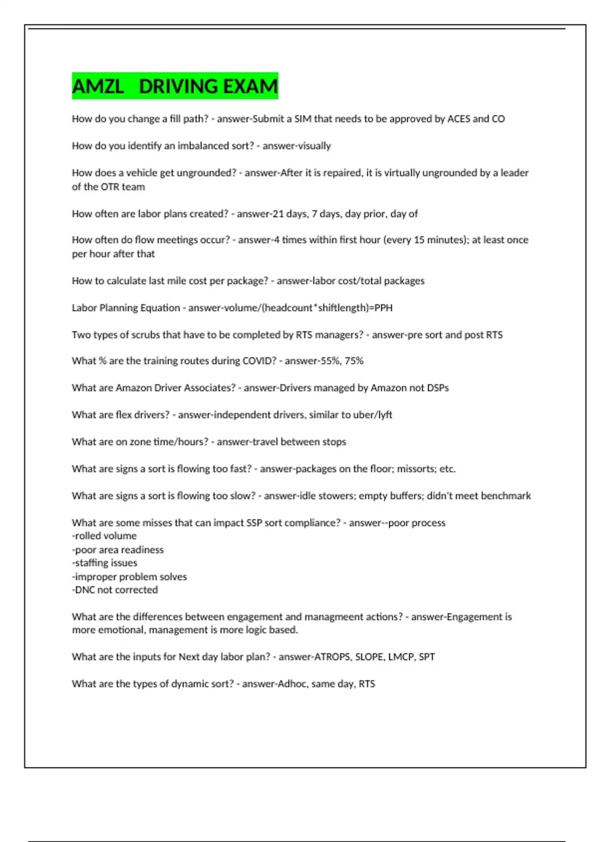 How do you change a fill path? - answer-Submit a SIM that needs to be approved by ACES and CO How do you identify an imbalanced sort? - answer-visually How does a vehicle get ungrounded? - answer-After it is repaired, it is virtually ungrounded by a leader of the OTR team How often are labor plans created? - answer-21 days, 7 days, day prior, day of How often do flow meetings occur? - answer-4 times within first hour (every 15 minutes); at least once per hour after that How to calculate last mile cost per package? - answer-labor cost/total packages Labor Planning Equation - answer-volume/(headcount*shiftlength)=PPH Two types of scrubs that have to be completed by RTS managers? - answer-pre sort and post RTS What % are the training routes during COVID? - answer-55%, 75% What are Amazon Driver Associates? - answer-Drivers managed by Amazon not DSPs What are flex drivers? - answer-independent drivers, similar to uber/lyft What are on zone time/hours? - answer-travel between stops What are signs a sort is flowing too fast? - answer-packages on the floor; missorts; etc. What are signs a sort is flowing too slow? - answer-idle stowers; empty buffers; didn't meet benchmark What are some misses that can impact SSP sort compliance? - answer--poor process -rolled volume -poor area readiness -staffing issues -improper problem solves -DNC not corrected What are the differences between engagement and managmeent actions? - answer-Engagement is more emotional, management is more logic based. What are the inputs for Next day labor plan? - answer-ATROPS, SLOPE, LMCP, SPT What are the types of dynamic sort? - answer-Adhoc, same day, RTS What are the various type of shipments that can be dynamically planned? - answer-RTS, dropped DSP routes, left behinds What are two types of packages that are handled by reverse logistics? - answer-Customer returns/abandoned packages What categories are covered during DSP DBR? - answer-DVCR, scan compliance, photo on delivery compliance, delivery completion rate What categories does the Mentor App measure? - answer-acceleration, braking, cornering, reversing, idling, distraction What causes the need for dynamic sort? - answer-didn't complete in CIT, sameday, undelivered packages What circumstances do we allow bags on top of boxes or vice versa? - answer-never What contents should be apart of a Stand-up meeting? - answer--safety tip -success story -standard work tip -quality tip -volume plan for the day -high
