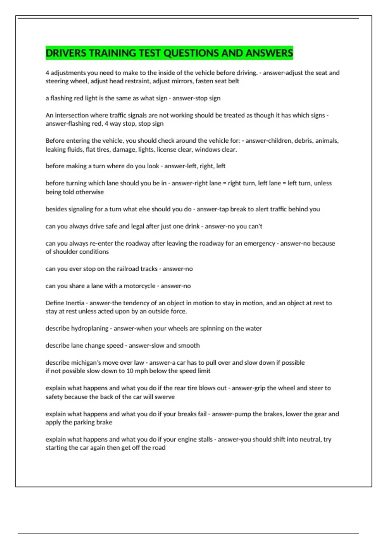 DRIVERS TRAINING TEST QUESTIONS AND ANSWERS