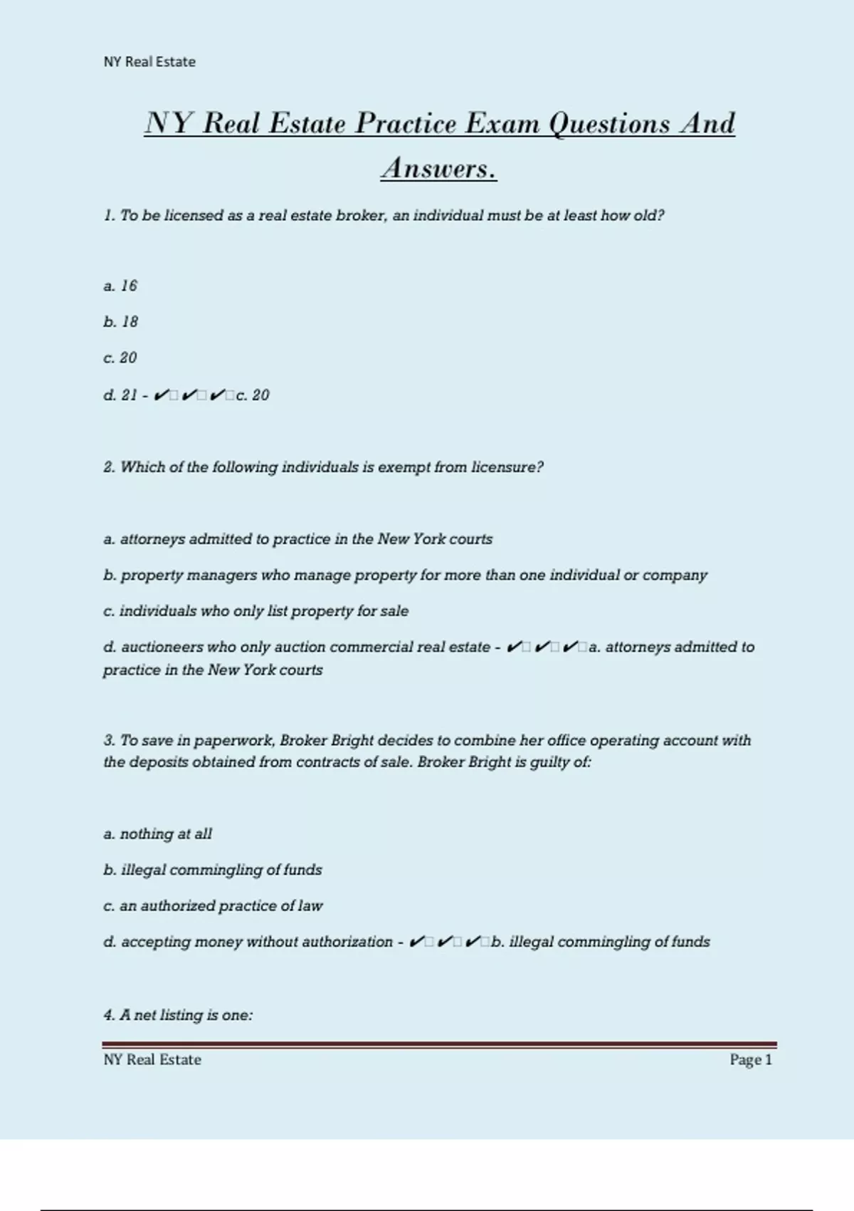 NY Real Estate Practice Exam Questions And Answers. 1. To be licensed as a real estate broker, an individual must be at least how old? a. 16 b. 18 c. 20 d. 21 - ️️️c. 20 2. Which of the following individuals is exempt from licensure? a. attorneys admitted to practice in the New York courts b. property managers who manage property for more than one individual or company c. individuals who only list property for sale d. auctioneers who only auction commercial real estate - ️️️a. attorneys admitted to practice in the New York courts 3. To save in paperwork, Broker Bright decides to combine her office operating account with the deposits obtained from contracts of sale. Broker Bright is guilty of: