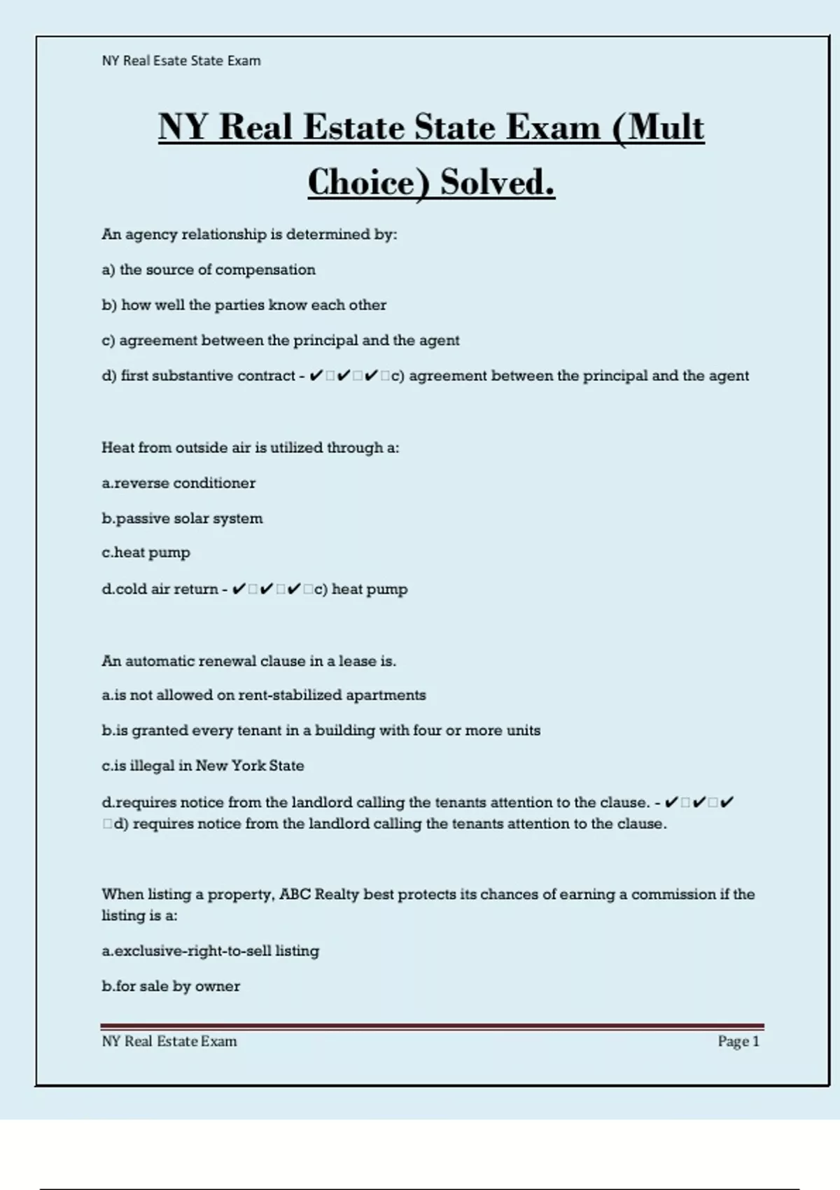 NY Real Estate State Exam (Mult Choice) Solved. An agency relationship is determined by: a) the source of compensation b) how well the parties know each other c) agreement between the principal and the agent d) first substantive contract - ️️️c) agreement between the principal and the agent Heat from outside air is utilized through a: se conditioner ve solar system pump air return - ️️️c) heat pump An automatic renewal clause in a lease is. not allowed on rent-stabilized apartments granted every tenant in a building with four or more units illegal in New York State res notice from the landlord calling the tenants attention to the clause. - ️️️d) requires notice from the landlord calling the tenants attention to the clause.