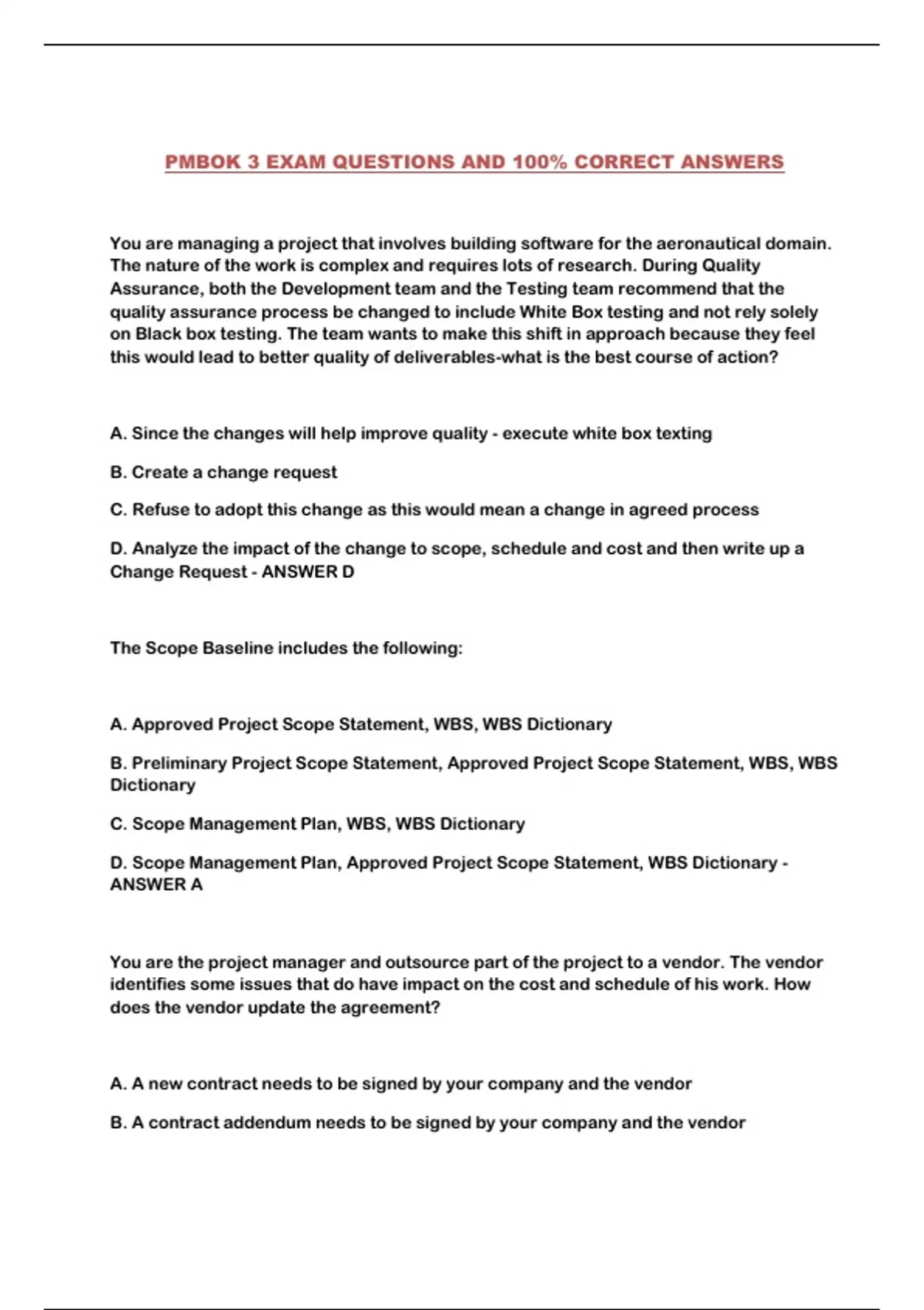 PMBOK 3 EXAM QUESTIONS AND 100% CORRECT ANSWERS