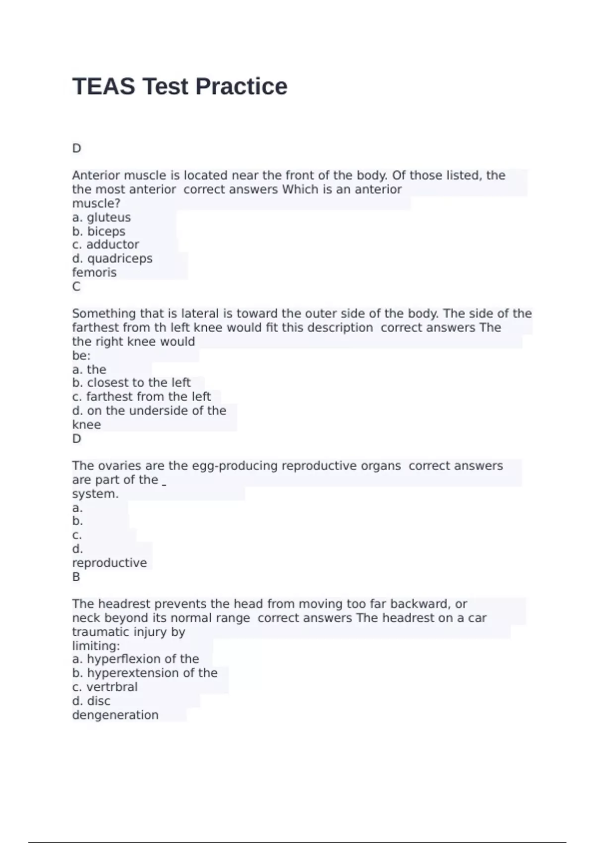 D Anterior muscle is located near the front of the body. Of those listed, the quadriceps is the most anterior correct answers Which is an anterior muscle? a. gluteus maximas b. biceps femoris c. adductor magnus d. quadriceps femoris C Something that is lateral is toward the outer side of the body. The side of the right knee farthest from th left knee would fit this description correct answers The lateral side of the right knee would be: a. the kneecap b. closest to the left knee c. farthest from the left knee d. on the underside of the knee D The ovaries are the egg-producing reproductive organs correct answers The ovaries are part of the ________system. a. skeletal b. nervous c. lymphatic d. reproductive B The headrest prevents the head from moving too far backward, or hyperextending the neck beyond its normal range correct answers The headrest on a car may prevent traumatic injury by limiting: a. hyperflexion of the neck b. hyperextension of the neck c. vertrbral compression d. disc dengeneration