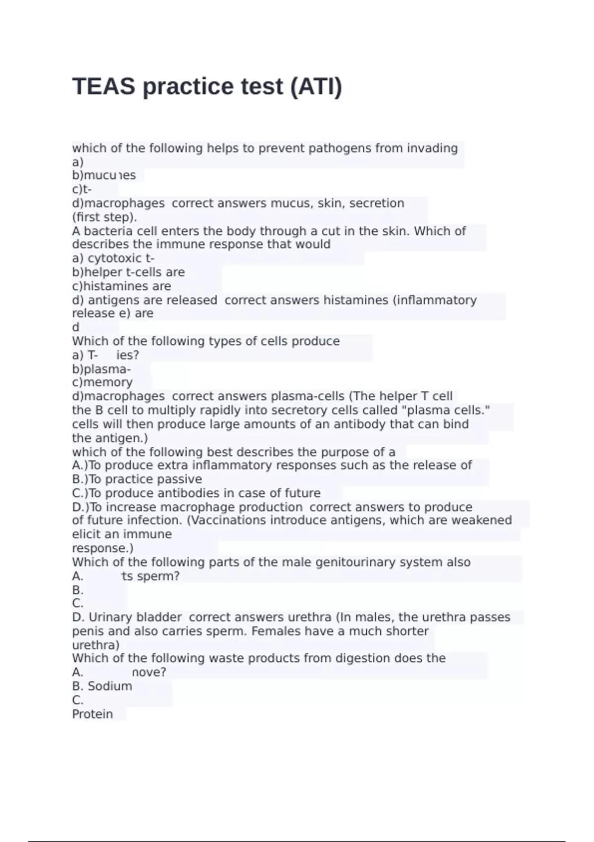 which of the following helps to prevent pathogens from invading the body? a) histamines b)mucus c)t-cells d)macrophages correct answers mucus, skin, secretion (first step). A bacteria cell enters the body through a cut in the skin. Which of the following describes the immune response that would occur next? a) cytotoxic t-cells b)helper t-cells are activated c)histamines are released d) antigens are released correct answers histamines (inflammatory response) are released Which of the following types of cells produce antibodies? a) T-cell b)plasma-cells c)memory cells d)macrophages correct answers plasma-cells (The helper T cell induces the B cell to multiply rapidly into secretory cells called "plasma cells." These plasma cells will then produce large amounts of an antibody that can bind the antigen.) which of the following best describes the purpose of a vaccine? A.)To produce extra inflammatory responses such as the release of histamines B.)To practice passive immunity C.)To produce antibodies in case of future infection D.)To increase macrophage production correct answers to produce antibodies in case of future infection. (Vaccinations introduce antigens, which are weakened or killed, to elicit an immune response.) Which of the following parts of the male genitourinary system also transports sperm? A. Ureter B. Urethra C. Uterus D. Urinary bladder correct answers urethra (In males, the urethra passes through the penis and also carries sperm. Females have a much shorter urethra) Which of the following waste products from digestion does the kidney remove? A. Nitrogen B. Sodium chloride C. Protein