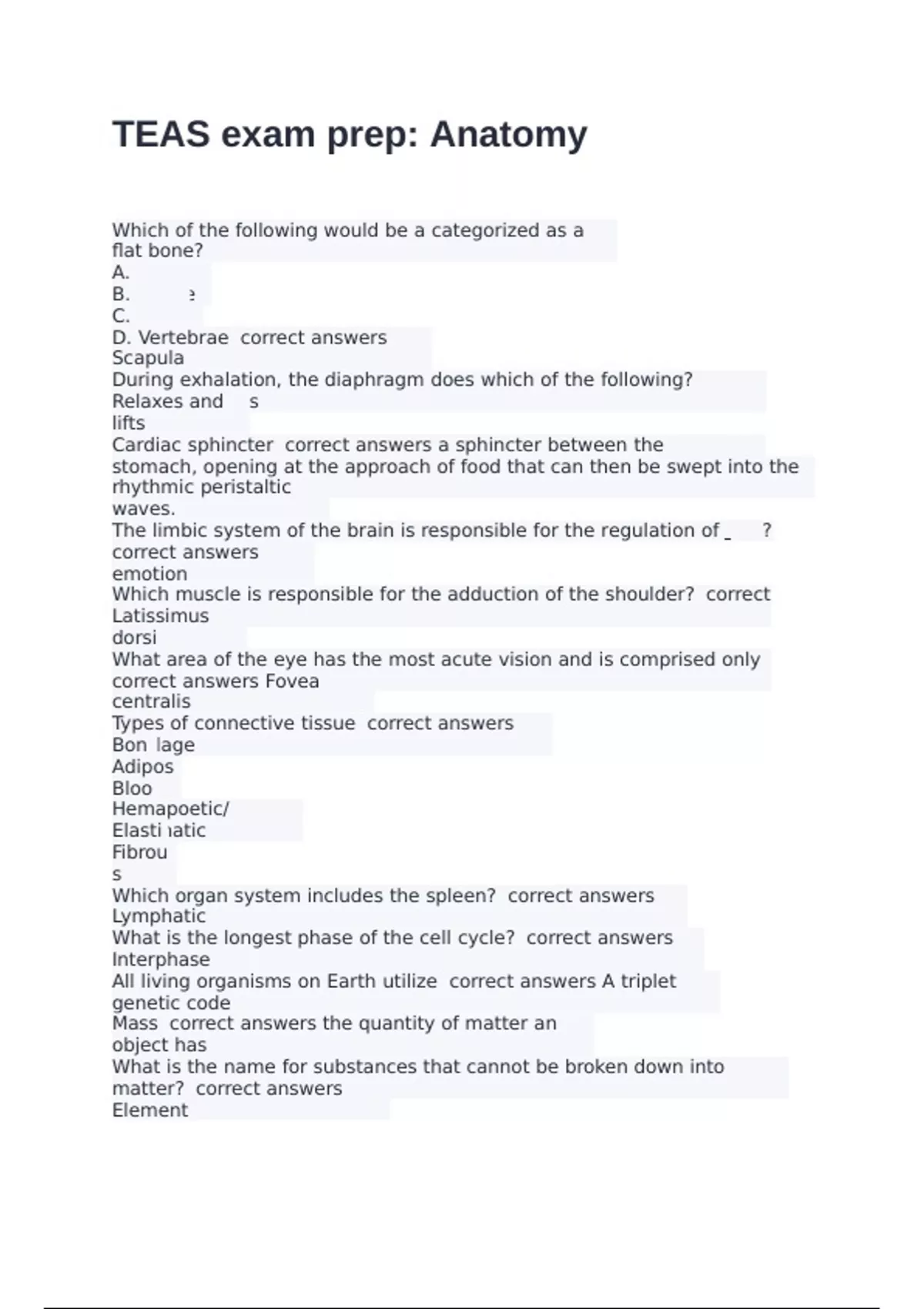 Which of the following would be a categorized as a flat bone? A. Mandible B. Femur C. Scapula D. Vertebrae correct answers Scapula During exhalation, the diaphragm does which of the following? correct answers Relaxes and lifts Cardiac sphincter correct answers a sphincter between the esophagus and the stomach, opening at the approach of food that can then be swept into the stomach by rhythmic peristaltic waves. The limbic system of the brain is responsible for the regulation of ___________? correct answers emotion Which muscle is responsible for the adduction of the shoulder? correct answers Latissimus dorsi What area of the eye has the most acute vision and is comprised only of cones? correct answers Fovea centralis Types of connective tissue correct answers Cartilage Bone Adipose Blood Hemapoetic/Lymphatic Elastic Fibrous Which organ system includes the spleen? correct answers Lymphatic What is the longest phase of the cell cycle? correct answers Interphase All living organisms on Earth utilize correct answers A triplet genetic code Mass correct answers the quantity of matter an object has What is the name for substances that cannot be broken down into simpler types of matter? correct answers Element
