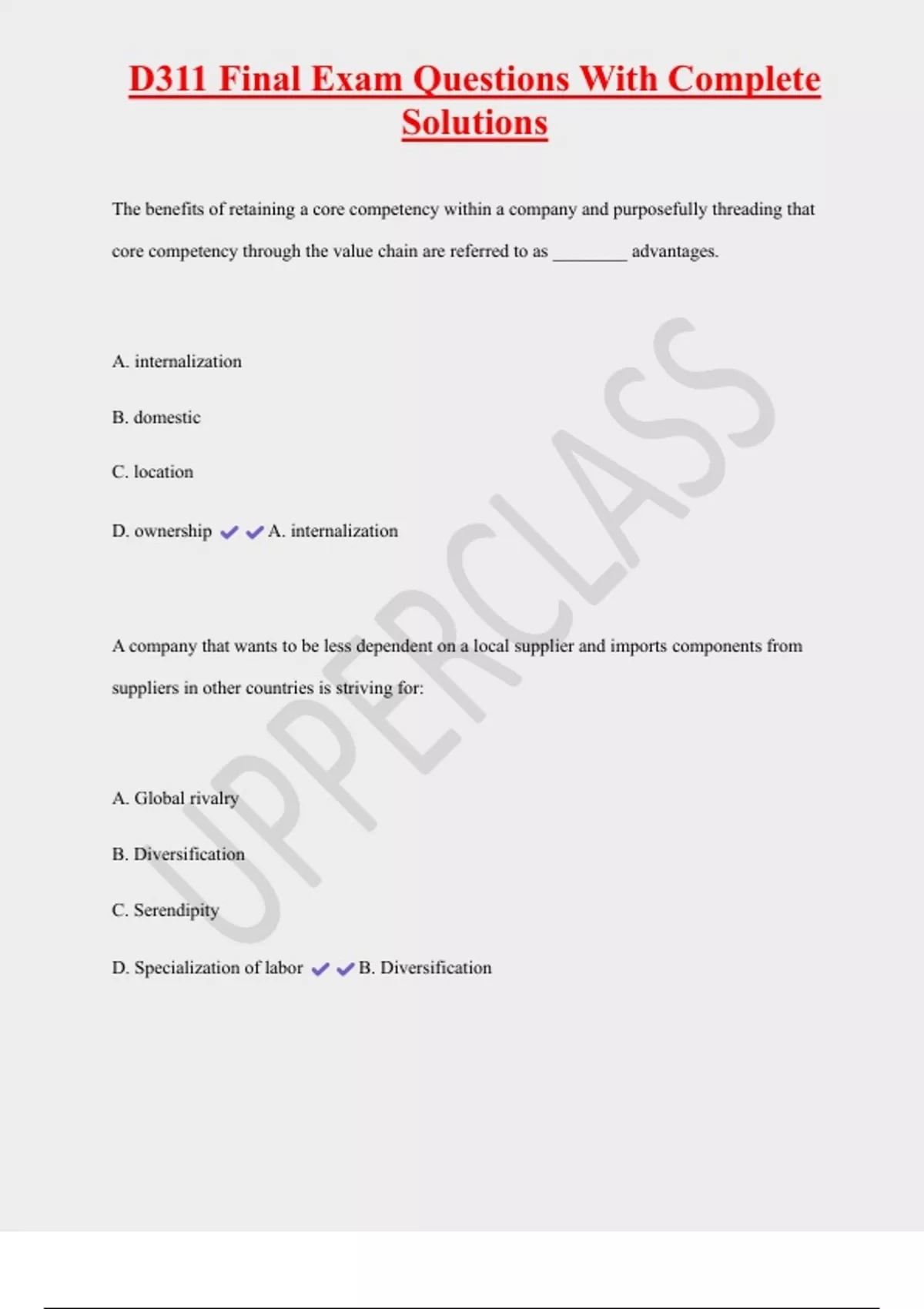 D311 Final Exam Questions With Complete Solutions The benefits of retaining a core competency within a company and purposefully threading that core competency through the value chain are referred to as ________ advantages. A. internalization B. domestic C. location D. ownership A. internalization