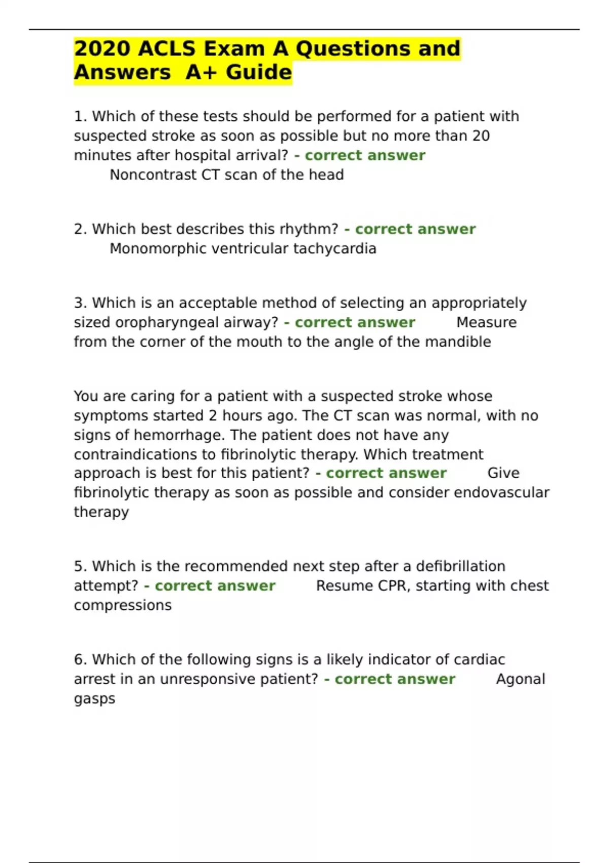2020 ACLS Exam A Questions and Answers A+ Guide.