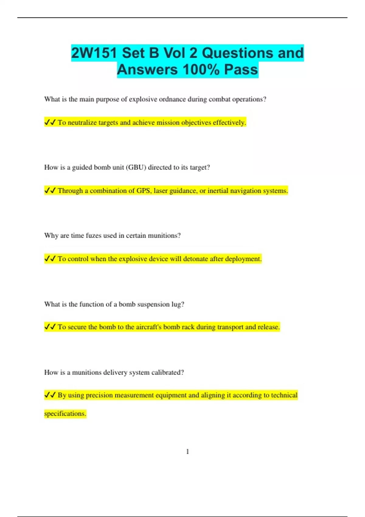 2W151 Set B Vol 2 Questions and Answers 100% Pass What is the main purpose of explosive ordnance during combat operations? To neutralize targets and achieve mission objectives effectively. How is a guided bomb unit (GBU) directed to its target? Through a combination of GPS, laser guidance, or inertial navigation systems. Why are time fuzes used in certain munitions? To control when the explosive device will detonate after deployment. What is the function of a bomb suspension lug? To secure the bomb to the aircraft's bomb rack during transport and release. How is a munitions delivery system calibrated? By using precision measurement equipment and aligning it according to technical specifications. 2 Why is it important to inspect arming solenoids in weapons systems? To ensure they function correctly and do not unintentionally arm a weapon. What is the role of an aircraft weapons load crew? To install, inspect, and verify the functionality of munitions on an aircraft. How does an air-to-ground missile differ from an air-to-air missile? Air-to-ground missiles target surface objectives, while air-to-air missiles target other aircraft. Why must munitions storage facilities have proper ventilation? To reduce the buildup of hazardous fumes and ensure safe storage conditions. What is a thermal battery, and where is it used in munitions? A thermal battery provides power for missile guidance systems and is activated during launch. How are munitions transported safely across a base? 3 By using approved vehicles and following strict transportation protocols. Why are weapon system components tested before deployment? To confirm that all systems are operational and ready for use in the field. What is the purpose of a pylon adapter in weapons systems?