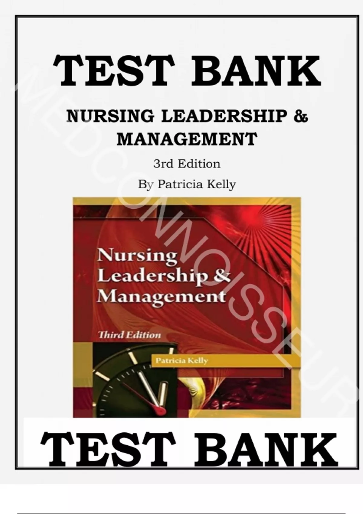 Test Bank for Nursing Leadership & Management 3rd Edition by Patricia Kelly 9781111306687 Chapter 1-31 Complete Guide. Test Bank Table of Contents: Unit I: NURSING LEADERSHIP AND MANAGEMENT. Chapter 1. Nursing Leadership and Management. Chapter 2. The Healthcare Environment. Chapter 3. Organizational Behavior and Magnet Hospitals. Chapter 4. Basic Clinical Healthcare Economics. Chapter 5. Evidence-Based Health Care. Chapter 6. Nursing and Healthcare Informatics. Chapter 7. Population Based Healthcare Practice. Unit II: LEADERSHIP AND MANAGEMENT OF THE INTERDISCIPLINARY TEAM. Chapter 8. Personal and Interdisciplinary Communication. Chapter 9. Politics and Consumer Partnerships. Chapter 10. Strategic Planning and organizing Patient Care. Chapter 11. Effective Team Building. Chapter 12. Power. Chapter 13. Change, Innovation, and Conflict Management. Unit III: LEADERSHIP AND MANAGEMENT OF PATIENT- CENTERED CARE. Chapter 14. Budget Concepts for Patient Care. Chapter 15. Effective Staffing. Chapter 16. Delegation of Patient Care. Chapter 17. Organization of Patient Care Management. Chapter 18. Time Management and Setting Patient Care Priorities. Chapter 19. Patient and Health Care Education. Unit IV: QUALITY IMPROVEMENT OF PATIENT OUTCOMES. Chapter 20. Managing Outcomes Using an Organizational Quality Improvement Model. Chapter 21. Evidence Based Strategies to Improve Patient Care Outcomes. Chapter 22. Decision Making and Critical Thinking. Chapter 23. Legal Aspects of Health Care. Chapter 24. Ethical Aspects of Health Care. Chapter 25. Culture, Generational Differences, and Spirituality. Unit V: LEADERSHIP AND MANAGEMENT OF SELF AND THE FUTURE. Chapter 26. Collective Bargaining. Chapter 27. Career Planning. Chapter 28. Nursing Job Opportunities. Chapter 29. Your First Job. Chapter 30. Healthy Living: Balancing Personal and Professional Needs. Chapter 31. NCLEX Preparation and Professionalism