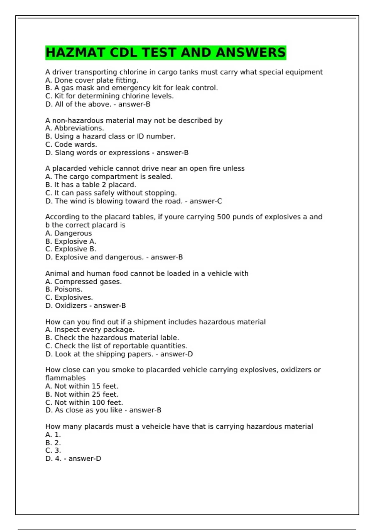 A driver transporting chlorine in cargo tanks must carry what special equipment A. Done cover plate fitting. B. A gas mask and emergency kit for leak control. C. Kit for determining chlorine levels. D. All of the above. - answer-B A non-hazardous material may not be described by A. Abbreviations. B. Using a hazard class or ID number. C. Code wards. D. Slang words or expressions - answer-B A placarded vehicle cannot drive near an open fire unless A. The cargo compartment is sealed. B. It has a table 2 placard. C. It can pass safely without stopping. D. The wind is blowing toward the road. - answer-C According to the placard tables, if youre carrying 500 punds of explosives a and b the correct placard is A. Dangerous B. Explosive A. C. Explosive B. D. Explosive and dangerous. - answer-B Animal and human food cannot be loaded in a vehicle with A. Compressed gases. B. Poisons. C. Explosives. D. Oxidizers - answer-B How can you find out if a shipment includes hazardous material A. Inspect every package. B. Check the hazardous material lable. C. Check the list of reportable quantities. D. Look at the shipping papers. - answer-D How close can you smoke to placarded vehicle carrying explosives, oxidizers or flammables A. Not within 15 feet. B. Not within 25 feet. C. Not within 100 feet. D. As close as you like - answer-B How many placards must a veheicle have that is carrying hazardous material A. 1. B. 2. C. 3. D. 4. - answer-D How should a common carrier transport material classified as forbidden on the hazardous material table A. Transport the material with an escort. B. Transport the material but dont open C.only transport in quantities less then 1000 lbs. D. Never transport the materials table. - answer-D How should you load cylinders of compressed gas A. In boxes that wont allow them to turn over. B. In racks attached to the vehicle. C. Held upright or braced laying down flat. D. Any of the above. - answer-D If a placarded vehicle gets a leaking or overheated tire while on the road the driver must A. Report to the carrier at the next stop B. Continue the trip at reduced speed. C. Stop when safe and fix the tire. D. Keep the tire on the vehicle but stop driving - answer-C If hazardous material is spilling form your vehicle you should A. Move 500 feet of less. B. Drive upwind from the spill. C. Not move anymore then safety requires D. Stay put on the roadway. - answer-C If there is an "X" or an "RQ" in the HM column of a shipping paper entry it means A. The material is hazardous. B. The shipment is regulated by hazardous material regulations. C. The carrier must report a spill of this material. D. All of the above. - answer-B In a hazardous material emergency the driver should A. Not smoke. B. Warn others and keep people away. C. Avoid contact or inhaling. D. All of the above. - answer-D Placarded vehicles cannot be parked within how many feet of an open fire A. 100. B. 200. C. 300. D. 400 - answer-C The driver of placarded vehicle must stop and check the dual tires A. Twice a day B. Once a day or every 200 miles. C. Every 2 hours or 100 miles. Whichever is less D. Using a tire pressure gauge or tire iron. - answer-C The drivers certificate of radioactive materials training must be: A. Kept at home. B. Kept at terminal. C. Kept in the drivers vehicle. D.carried by driver - answer-D The person watching a placarded vehicle must A. Be awake and in the vehicle or within 100 feet. B. Be aware of the hazards of the load. C. Know what to do in an emergency. D. All of the above. - answer-D The total transport index of all radioactive material in a single vehicle must not exceed A. The number of packages in the vehicle. B. The smallest number on the radioactive separation table. C. 25. D. 50. - answer-D What amount of chlorine that is being transported requires the driver to stop before railroad crossings A. An amount requiring a table 2 placard. B. Any amount. C. Any amount when combined with explosives A. D. 1000 lbs or more - answer-B What document must a driver of a vehicle have in his possession when transporting class A or B explosives A. A copy of FMCSR part 397. B. Written route plan and emergency instructions C. Shipping papers. D. All of the above - answer-D What fire extinguisher rating is required to be in the power unit of the placarded vehicle A. UL rating of 5 B:C or more B. UL rating of 10 B:C or more. C. UL rating of 15 B:C or more. D. UL rating of 100 B:C or more. - answer-B What is not a responsibility of the shipper? A. Labeling. B. Packaging. C. Placarding. D. Preparing shipping papers. - answer-C What is the carrect order of the description of hazardous material on the shipping paper A. ID number, hazard class, proper shipping name. B. Shipping name, hazard class, ID number. C. Hazard class,ID number, shipping name. D. Any order is correct as long as all three are there - answer-B What is the intent of the hazardous material regulations found in title 49 CFR? A. To contain the material. B. To communicate the risk. C. Assure safe drivers and equipment. D. All of the above. - answer-D What is the meaning of the transport index on the labels of radioactive 2 packages A. It indicates the degree of control needed during transportation. B. It is used by D.O.T. inspectors only. C. It indicates what kind of mixed loads are safe. D. It indicates the correct placard to use. - answer-A What is the only exception to the rule that the shippers certifies that he has packaged the material according to the regulations A. The shipper is a private carrier carrying his own product. B. The drivers cargo compartment is sealed. C. The trip will not cross state lines. D. The shipment is hazardous waste. - answer-A What is the purpose of a uniform hazardous waste manifest A. It indicates that youre carrying hazardous material. B. It indicates that youre carrying hazardous waste. C. It is exactly the same as a shipping paper. D. All of the above. - answer-B What kind of roadside emergency warning device