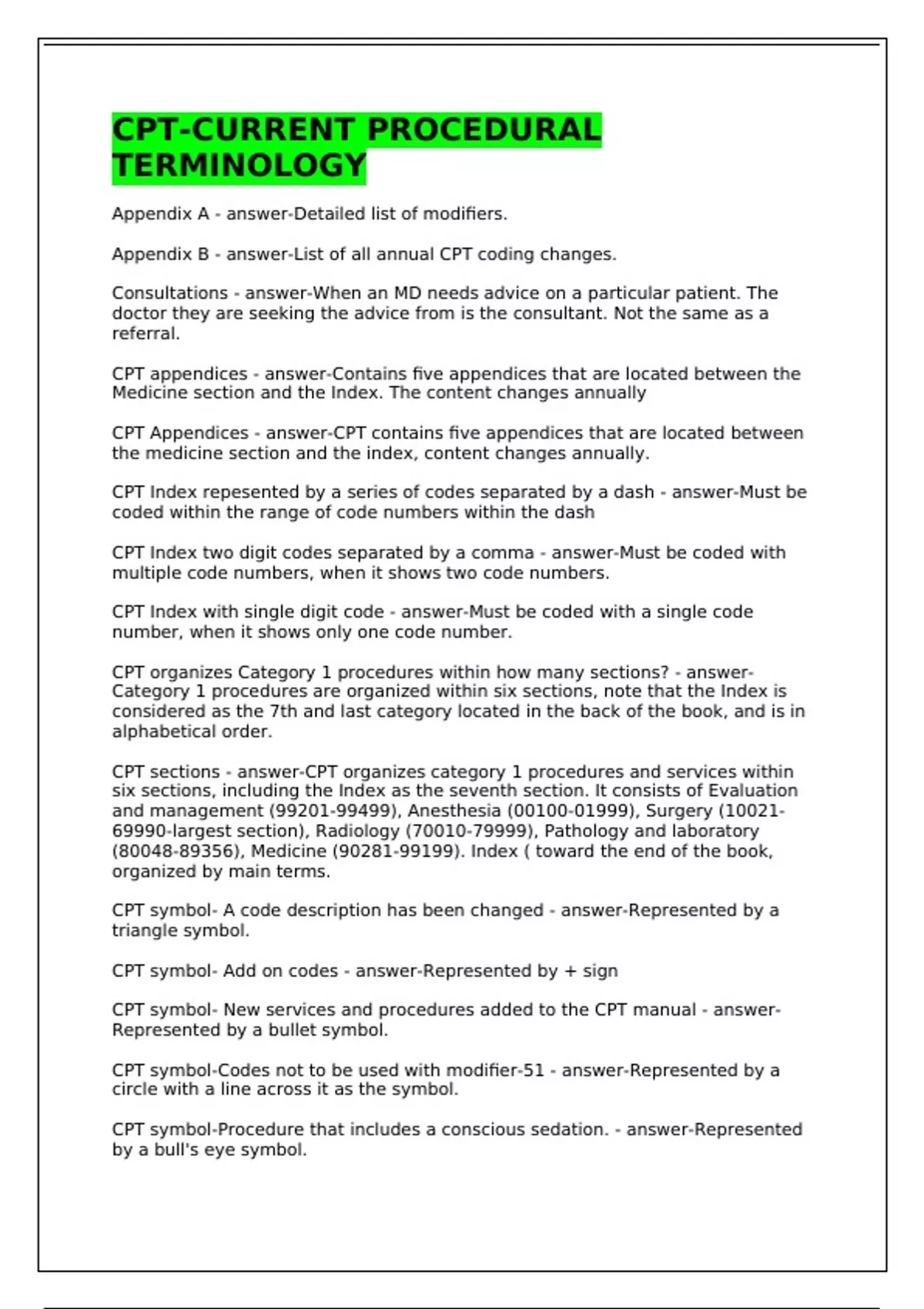 Appendix A - answer-Detailed list of modifiers. Appendix B - answer-List of all annual CPT coding changes. Consultations - answer-When an MD needs advice on a particular patient. The doctor they are seeking the advice from is the consultant. Not the same as a referral. CPT appendices - answer-Contains five appendices that are located between the Medicine section and the Index. The content changes annually CPT Appendices - answer-CPT contains five appendices that are located between the medicine section and the index, content changes annually. CPT Index repesented by a series of codes separated by a dash - answer-Must be coded within the range of code numbers within the dash CPT Index two digit codes separated by a comma - answer-Must be coded with multiple code numbers, when it shows two code numbers. CPT Index with single digit code - answer-Must be coded with a single code number, when it shows only one code number. CPT organizes Category 1 procedures within how many sections? - answer-Category 1 procedures are organized within six sections, note that the Index is considered as the 7th and last category located in the back of the book, and is in alphabetical order. CPT sections - answer-CPT organizes category 1 procedures and services within six sections, including the Index as the seventh section. It consists of Evaluation and management (), Anesthesia (0), Surgery (-largest section), Radiology (), Pathology and laboratory (), Medicine (). Index ( toward the end of the book, organized by main terms. CPT symbol- A code description has been changed - answer-Represented by a triangle symbol. CPT symbol- Add on codes - answer-Represented by + sign CPT symbol- New services and procedures added to the CPT manual - answer-Represented by a bullet symbol. CPT symbol-Codes not to be used with modifier-51 - answer-Represented by a circle with a line across it as the symbol. CPT symbol-Procedure that includes a conscious sedation. - answer-Represented by a bull's eye symbol. CPT symbol-Used around revised guidelines and notes - answer-Represented by two horizontal triangles <> CPT use is for - answer-reports services and procedures performed on patients. CPT was published in what year and by whom? - answer-AMA first published CPT in 1966 CPT-Current procedural terminology - answer-Is a listing of descriptive terms and identifying codes for reporting medical services and procedures. Published in 1966 by AMA. It provides a uniform language that describes medical, surgical, and dx svcs. to facilitate communication among providers, patients, and insurers. Critcal care service - answer-determined by the amount of time the MD spends with the patient. Define Medical neccessity - answer-To establish why a procedure was requested in order to be coded and billed. Define referral - answer-Is a permission tha the insurance company needs to authorized payment for the visit, this authorization gets faxed to the specialist for payment for the encounter with the patient. Definition of a modifier - answer-two digit number added to the end of a code to give more information about the procedure. Emergency department services - answer-used for new or established patient who receive care in the E/m dpt. . These codes will bring high reimbursement. Established office visits - answer-code used for patients seen within 3 years. 99211 code is used when patient received servie from someone other than MD (nuse, MA), usually less than 5 minutes in duration. Two of the three criteria must be met. Evaluation & Management - answer-codes for broad categories such as office, hospitals and consultation visits. First section of the CPT manual. Give code categories for Anesthesia - answer- Give code categories for Evaluation and management - answer- Give code categories for Medicine - answer- Give code categories for Radiology - answer- Give code categories for Surgery - answer- (largest section-coded by body systems) Give code category for Pathology and Laboratory - answer- Guidelines - answer-Located at the beginning of each CPT section and should be carefully reviewed before attempting to code. They give instructions on how to code certain sections. HCPS (hicks picks)/Healthcare common procedure - answer-Created by medicare 1983. Also CPT codes required by Medicare, and are found in a different book Hospital inpatient services - answer-one who has been formally admitted to an acute care facility. Hospital observation services - answer-a patient who does not need care as intensive as an inpatient but must remain in the hospital for a short period of time. Patient is NOT ADMITTED. Key components in selecting a level fo Evaluation and Management services - answer-History, Physical exam or examination, and medical decision making Name CPT Sections - answer-Evaluation & Management (), Anesthesia (), Surgery (-Lgst. sec.), Radiology (), Pathology & Laboratory (), Medicine () New patient office visits - answer-When coding a new patient all three criteria must apply to use code. Patient has not ever see the MD before or not in the past 3 years. MD must spend more time with the patient so it will increase reimbursement. Subsequent hospitl care - answer-Patient received follow up care while in the hospital. Used to code for daily hospital visits hile patient is hospitalized. Superbill - answer-Is a financial document, it represents what the MD charges for each procedure and must be backed up by the list of charges being billed. Three factors of Evaluation and Management codes - answer-Place of service-setting in which services are provided. Type of service-reason service is requested. Patient status-new patient, established patient (seen in last three years, if more than three years, patient is considered as a new patient), outpatient (ambulatory), and inpatient (somewhere in the hospital). Unlisted Procedures and Services - answer-a code assigned when there is a procedure performed for which there is no CPT code. A special report must ac