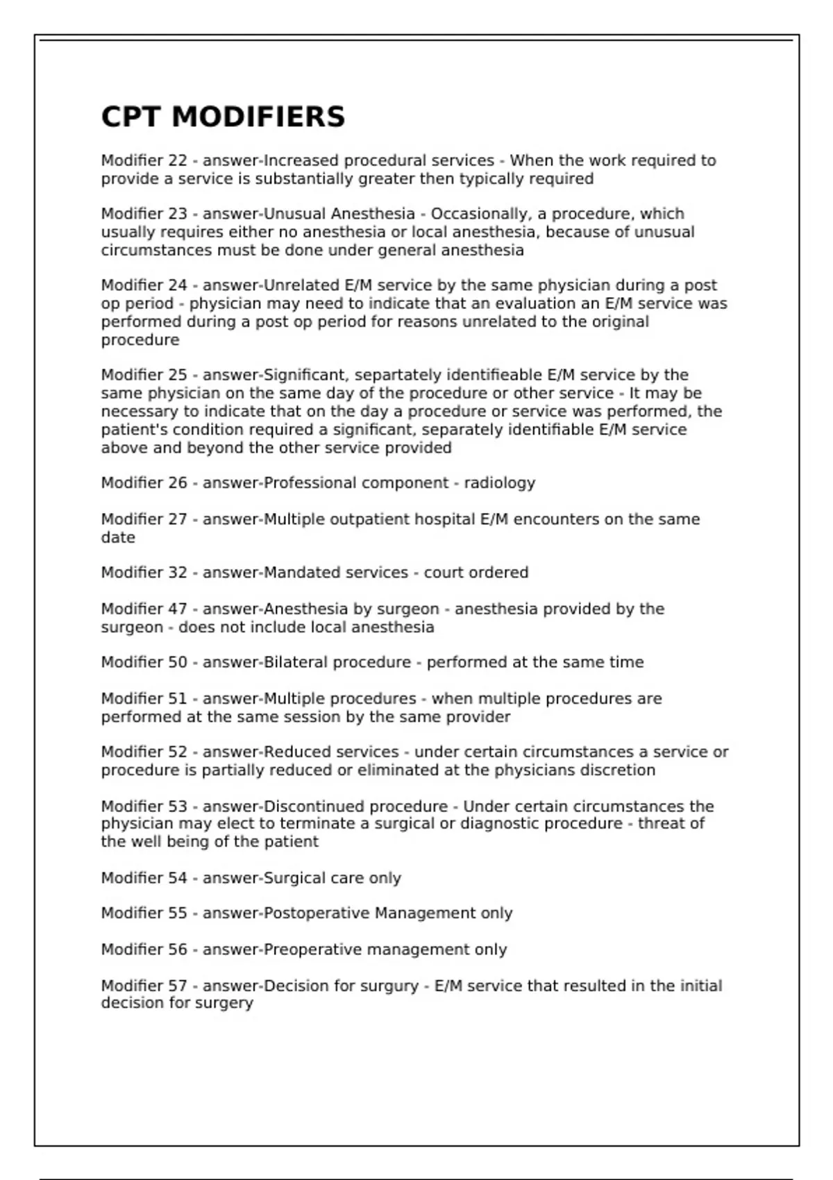 Modifier 22 - answer-Increased procedural services - When the work required to provide a service is substantially greater then typically required Modifier 23 - answer-Unusual Anesthesia - Occasionally, a procedure, which usually requires either no anesthesia or local anesthesia, because of unusual circumstances must be done under general anesthesia Modifier 24 - answer-Unrelated E/M service by the same physician during a post op period - physician may need to indicate that an evaluation an E/M service was performed during a post op period for reasons unrelated to the original procedure Modifier 25 - answer-Significant, separtately identifieable E/M service by the same physician on the same day of the procedure or other service - It may be necessary to indicate that on the day a procedure or service was performed, the patient's condition required a significant, separately identifiable E/M service above and beyond the other service provided Modifier 26 - answer-Professional component - radiology Modifier 27 - answer-Multiple outpatient hospital E/M encounters on the same date Modifier 32 - answer-Mandated services - court ordered Modifier 47 - answer-Anesthesia by surgeon - anesthesia provided by the surgeon - does not include local anesthesia Modifier 50 - answer-Bilateral procedure - performed at the same time Modifier 51 - answer-Multiple procedures - when multiple procedures are performed at the same session by the same provider Modifier 52 - answer-Reduced services - under certain circumstances a service or procedure is partially reduced or eliminated at the physicians discretion Modifier 53 - answer-Discontinued procedure - Under certain circumstances the physician may elect to terminate a surgical or diagnostic procedure - threat of the well being of the patient Modifier 54 - answer-Surgical care only Modifier 55 - answer-Postoperative Management only Modifier 56 - answer-Preoperative management only Modifier 57 - answer-Decision for surgury - E/M service that resulted in the initial decision for surgery Modifier 58 - answer-Staged of related procedure or service by the same physician during the post op period - planned or anticipated, more extensive that the original procedur