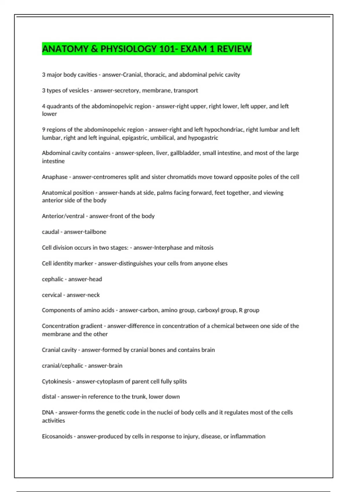 3 major body cavities - answer-Cranial, thoracic, and abdominal pelvic cavity 3 types of vesicles - answer-secretory, membrane, transport 4 quadrants of the abdominopelvic region - answer-right upper, right lower, left upper, and left lower 9 regions of the abdominopelvic region - answer-right and left hypochondriac, right lumbar and left lumbar, right and left inguinal, epigastric, umbilical, and hypogastric Abdominal cavity contains - answer-spleen, liver, gallbladder, small intestine, and most of the large intestine Anaphase - answer-centromeres split and sister chromatids move toward opposite poles of the cell Anatomical position - answer-hands at side, palms facing forward, feet together, and viewing anterior side of the body Anterior/ventral - answer-front of the body caudal - answer-tailbone Cell division occurs in two stages: - answer-Interphase and mitosis Cell identity marker - answer-distinguishes your cells from anyone elses cephalic - answer-head cervical - answer-neck Components of amino acids - answer-carbon, amino group, carboxyl group, R group Concentration gradient - answer-difference in concentration of a chemical between one side of the membrane and the other Cranial cavity - answer-formed by cranial bones and contains brain cranial/cephalic - answer-brain Cytokinesis - answer-cytoplasm of parent cell fully splits distal - answer-in reference to the trunk, lower down DNA - answer-forms the genetic code in the nuclei of body cells and it regulates most of the cells activities Eicosanoids - answer-produced by cells in response to injury, disease, or inflammation Electrical gradient - answer-difference in concentration of ions between one side of the membrane and the other Enzymes - answer-a catalyst in a living cell Fized ribosomes - answer-proteins are packaged for secretion Free ribosomes - answer-proteins enter cytosol Frontal plane - answer-splits body into anterior and posterior halves (front and back) function of the secretory vesicle - answer-exports proteins from cell by exocytosis function of the transport vesicle - answer-takes product to lysosome Functions of microtubules - answer-contribute to cell strength and rigidity, anchor organelles, and contribute to the formation of cilia G1 phase - answer-organelles and cytosolic components are duplicated G2 phase - answer-cell growth continues, enzymes and other proteins are synthesized Glycocalyx - answer-allows cells to distinguish themselves from one another Golgi complex - answer-modifies and packages products from ER exocytosis, rewnews/modifies cell membrane, packages special enzymes for intracellular use Homeostasis - answer-a condition of equilibrium in the body's internal environment maintained by a regulatory process Hydrostatic pressure - answer-pressure that water exerts on walls of structure (causes movement) inferior - answer-lower down Integral proteins - answer-don't move: include receptors Intermediate filaments functions - answer-cell strength and shape, stabilize organelle position Ion channel - answer-open channel proteins for several common ions lateral - answer-further away Least to most complex structural organization - answer-chemical, cellular, tissue, organ, system, organism Linker - answer-helps cell move or link cell to other cells within the body Lysosomes function - answer-recycle old cells, autolysis medial - answer-closer to the center of the body Mediastunim - answer-extends from the sternum to vertebral column and from first rib to the diaphragm (contains heart, thymus, esophagus, trachea, and large BV) Membranous components of the cytoplasm - answer-ER, Golgi apparatus, lysosomes, mitochondria Metaphase - answer-centromeres of chromosomes line up at the metaphase plate Microfilaments are composed of - answer-actin and myosin Microtubules are made from the protein - answer-tubulin Mid-sagittal plane - answer-cuts body right down the middle Mitochondria - answer-energy producing organelle Negative feedback - answer-disruption of homeostasis causes a chain reaction that brings the body back to normal conditions (ex: body temperature and blood pressure) Non membranous components of the cytoplasm - answer-cytoskeleton, microvilli, centrioles, cilia, ribosomes Nucleus - answer-largest cell structure- control center for cellular operations Osmosis - answer-the net movement of a solvent through a selectively permeable membrane from an area of high concentration to an area of low concentration Osmotic pressure - answer-pressure needed to overcome hydrostatic pressure Parrica