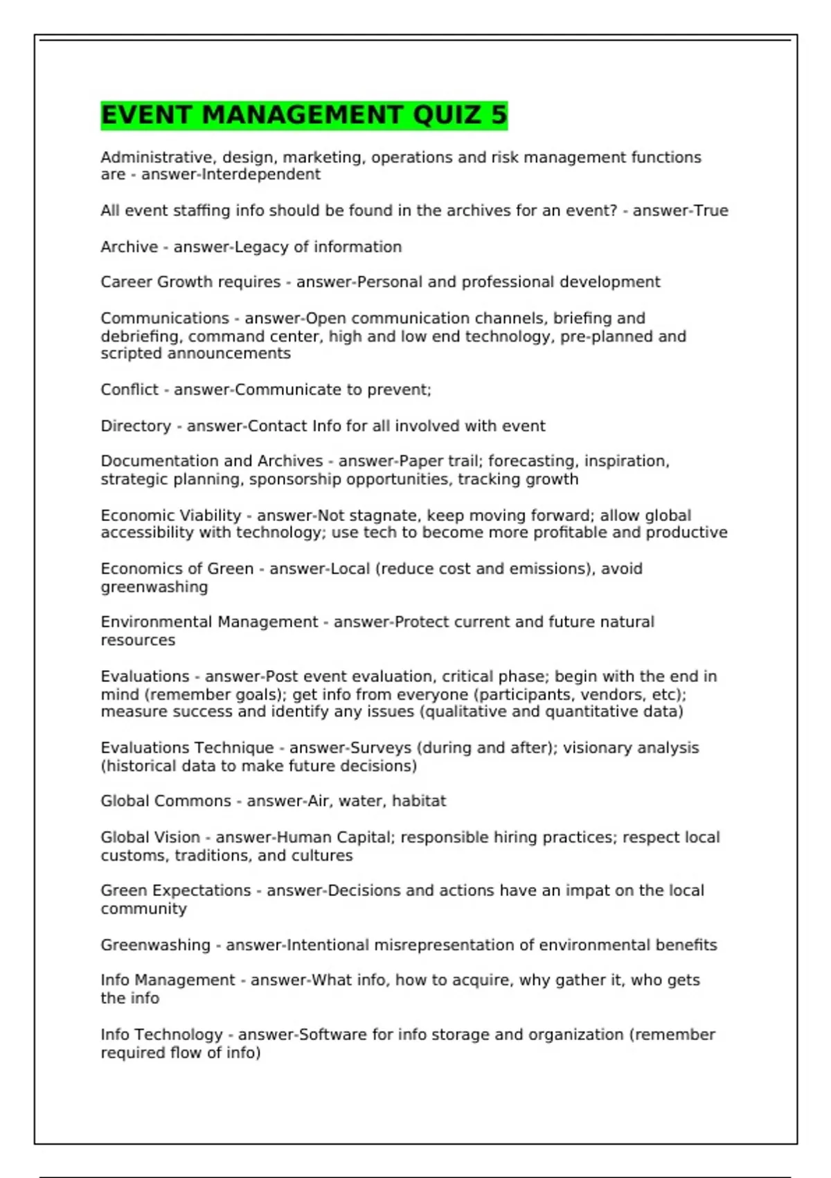 Administrative, design, marketing, operations and risk management functions are - answer-Interdependent All event staffing info should be found in the archives for an event? - answer-True Archive - answer-Legacy of information Career Growth requires - answer-Personal and professional development Communications - answer-Open communication channels, briefing and debriefing, command center, high and low end technology, pre-planned and scripted announcements Conflict - answer-Communicate to prevent; Directory - answer-Contact Info for all involved with event Documentation and Archives - answer-Paper trail; forecasting, inspiration, strategic planning, sponsorship opportunities, tracking growth Economic Viability - answer-Not stagnate, keep moving forward; allow global accessibility with technology; use tech to become more profitable and productive Economics of Green - answer-Local (reduce cost and emissions), avoid greenwashing Environmental Management - answer-Protect current and future natural resources Evaluations - answer-Post event evaluation, critical phase; begin with the end in mind (remember goals); get info from everyone (participants, vendors, etc); measure success and identify any issues (qualitative and quantitative data) Evaluations Technique - answer-Surveys (during and after); visionary analysis (historical data to make future decisions) Global Commons - answer-Air, water, habitat Global Vision - answer-Human Capital; responsible hiring practices; respect local customs, traditions, and cultures Green Expectations - answer-Decisions and actions have an impat on the local community Greenwashing - answer-Intentional misrepresentation of environmental benefits Info Management - answer-What info, how to acquire, why gather it, who gets the info Info Technology - answer-Software for info storage and organization (remember required flow of info) Insufficient illumination can result in - answer-invisible hazards and anonymous assaults Insurance - answer-Protect yourself, check for exclusions Insurance policies must be checked for - answer-exclusions Local-to-Global Connection - answer-Recognize impact to the Global Commons Medical/Emergency - answer-Level of services provided, emergency response plan, access and egress, prepare for the worst and practice your plan Monitoring - answer-Proactive rather than reactive Monitoring Performance - answer-Checkpoints (adjust training) and coaching Organize and Control Info - answer-Internal Checklists, contracts and invoices for processing info Paid Staff - answer-Workforce employment issues People - answer-Social impacts, is the event socially desirable, does anyone want to come? is it culturally acceptable? physiologically nurturing? Personnel Management - answer-Recruitment and selection (1st component); orientation sessions (info given?); instruction manuals and handbooks; training programs; scheduling and assignments; motivation, recognition, and retention Planet - answer-Environmentally conscious? Post Event Surveys - answer-Processes, procedures, policies; programming for events; products, purchasing, and pricing Prevention, contingency, and emergency plans should - answer-address the consequences should a situation occur