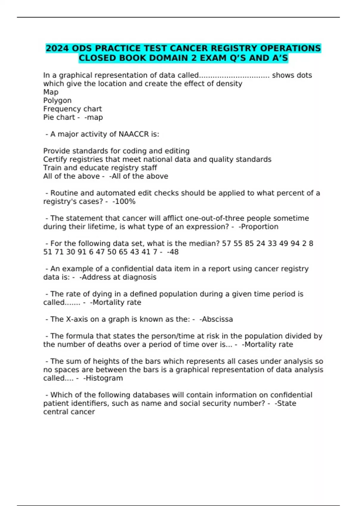 2024 ODS PRACTICE TEST CANCER REGISTRY OPERATIONS CLOSED BOOK DOMAIN 2 EXAM Q’S AND A’S