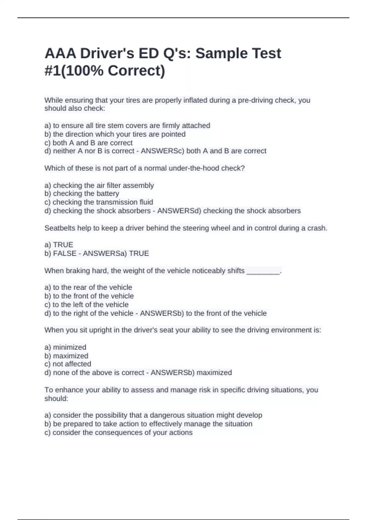 While ensuring that your tires are properly inflated during a pre-driving check, you should also check: a) to ensure all tire stem covers are firmly attached b) the direction which your tires are pointed c) both A and B are correct d) neither A nor B is correct - ANSWERSc) both A and B are correct Which of these is not part of a normal under-the-hood check? a) checking the air filter assembly b) checking the battery c) checking the transmission fluid d) checking the shock absorbers - ANSWERSd) checking the shock absorbers Seatbelts help to keep a driver behind the steering wheel and in control during a crash. a) TRUE b) FALSE - ANSWERSa) TRUE When braking hard, the weight of the vehicle noticeably shifts ________. a) to the rear of the vehicle b) to the front of the vehicle c) to the left of the vehicle d) to the right of the vehicle - ANSWERSb) to the front of the vehicle When you sit upright in the driver's seat your ability to see the driving environment is: a) minimized b) maximized c) not affected d) none of the above is correct - ANSWERSb) maximized To enhance your ability to assess and manage risk in specific driving situations, you should: a) consider the possibility that a dangerous situation might develop b) be prepared to take action to effectively manage the situation c) consider the consequences of your actions d)
