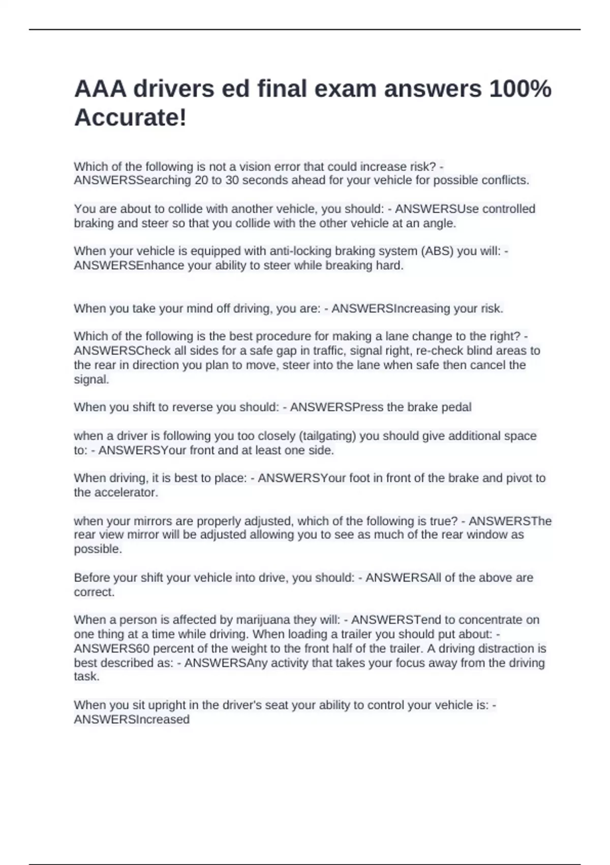 AAA drivers ed final exam answers 100% Accurate!