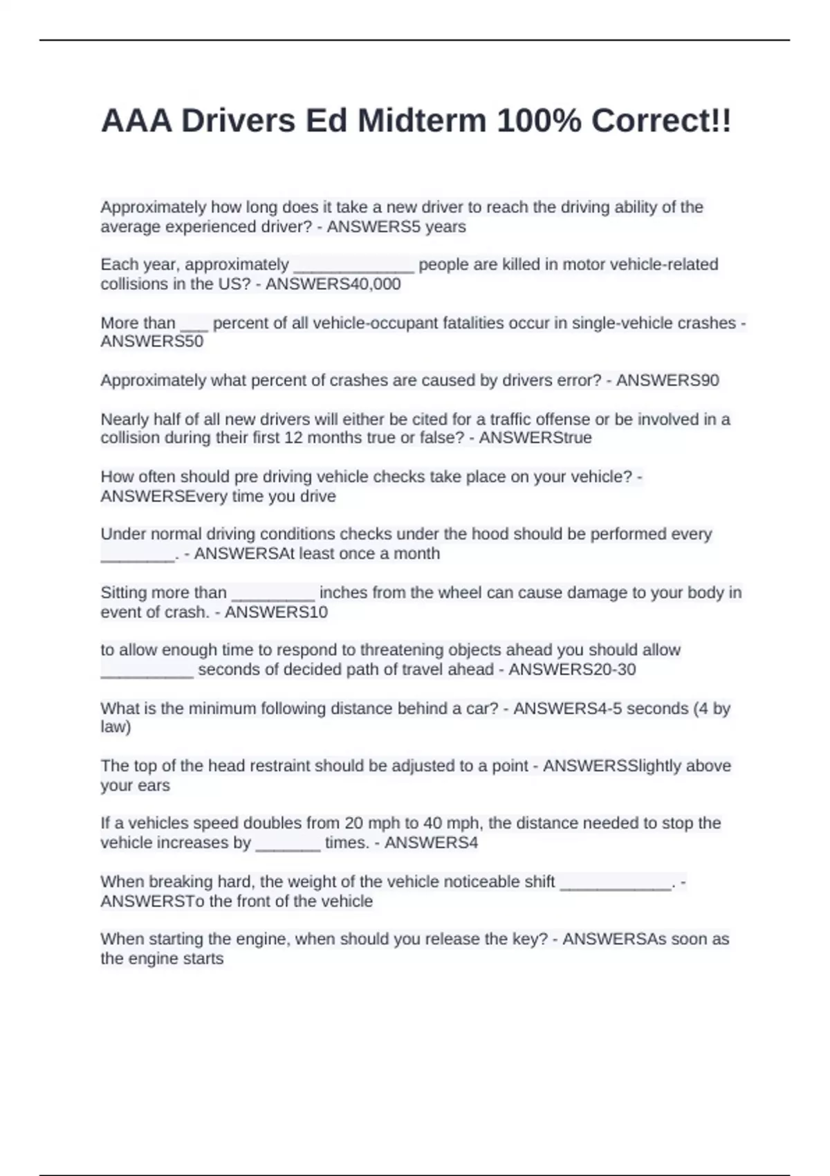 Approximately how long does it take a new driver to reach the driving ability of the average experienced driver? - ANSWERS5 years Each year, approximately _____________ people are killed in motor vehicle-related collisions in the US? - ANSWERS40,000 More than ___ percent of all vehicle-occupant fatalities occur in single-vehicle crashes - ANSWERS50 Approximately what percent of crashes are caused by drivers error? - ANSWERS90 Nearly half of all new drivers will either be cited for a traffic offense or be involved in a collision during their first 12 months true or false? - ANSWERStrue How often should pre driving vehicle checks take place on your vehicle? - ANSWERSEvery time you drive Under normal driving conditions checks under the hood should be performed every ________. - ANSWERSAt least once a month Sitting more than _________ inches from the wheel can cause damage to your body in event of crash. - ANSWERS10 to allow enough time to respond to threatening objects ahead you should allow __________ seconds of decided path of travel ahead - ANSWERS20-30 What is the minimum following distance behind a car? - ANSWERS4-5 seconds (4 by law) The top of the head restraint should be adjusted to a point - ANSWERSSlightly above your ears If a vehicles speed doubles from 20 mph to 40 mph, the distance needed to stop the vehicle increases by _______ times. - ANSWERS4 When breaking hard, the weight of the vehicle noticeable shift ____________. -