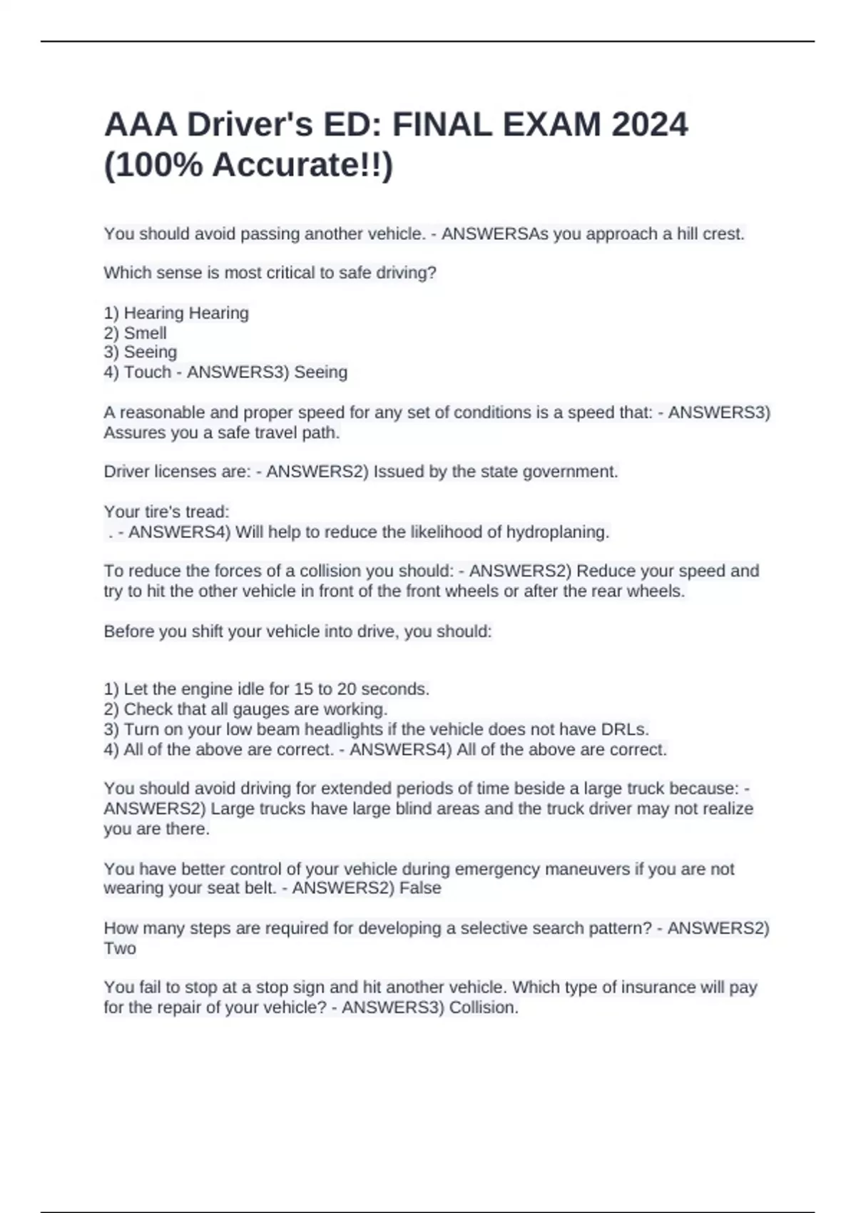 You should avoid passing another vehicle. - ANSWERSAs you approach a hill crest. Which sense is most critical to safe driving? 1) Hearing Hearing 2) Smell 3) Seeing 4) Touch - ANSWERS3) Seeing A reasonable and proper speed for any set of conditions is a speed that: - ANSWERS3) Assures you a safe travel path. Driver licenses are: - ANSWERS2) Issued by the state government. Your tire's tread: . - ANSWERS4) Will help to reduce the likelihood of hydroplaning. To reduce the forces of a collision you should: - ANSWERS2) Reduce your speed and try to hit the other vehicle in front of the front wheels or after the rear wheels. Before you shift your vehicle into drive, you should: 1) Let the engine idle for 15 to 20 seconds. 2) Check that all gauges are working. 3) Turn on your low beam headlights if the vehicle does not have DRLs. 4) All of the above are correct. - ANSWERS4) All of the above are correct. You should avoid driving for extended periods of time beside a large truck because: - ANSWERS2) Large trucks have large blind areas and the truck driver may not realize you are there. You have better control of your vehicle during emergency maneuvers if you are not wearing your seat belt. - ANSWERS2) False How m