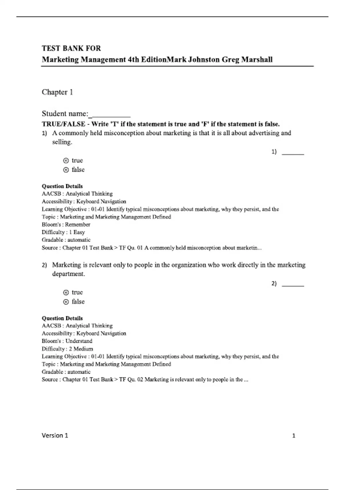 ANSWERS ARE AT THE END OF EACH CHAPTER Test Bank for Marketing Management 4th Edition By Mark Johnston Greg Marshall | Answers are at the end of each chapter TABLE OF CONTENTS: Chapter 1: Marketing in Today’s Business Milieu Chapter 2: Marketing Foundations: Global, Ethical,Sustainable Chapter 3: Elements of Marketing Strategy, Planning, and Competition Chapter 4: Market Research Essentials Chapter 5: CRM, Big Data, and Marketing Analytics Chapter 6: Understand Consumer and Business Markets Chapter 7: Segmentation, Target Marketing, and Positioning Chapter 8: Product Strategy and New Product Development Chapter 9: Build the Brand Chapter 10: Service as the Core Offering Chapter 11: Manage Pricing Decisions Chapter 12: Manage Marketing Channels, Logistics, and Supply Chain Chapter 13: Promotion Essentials: Digital and Social Media Marketing Chapter 14: Promotion Essentials: Legacy Approaches and Personal Selling