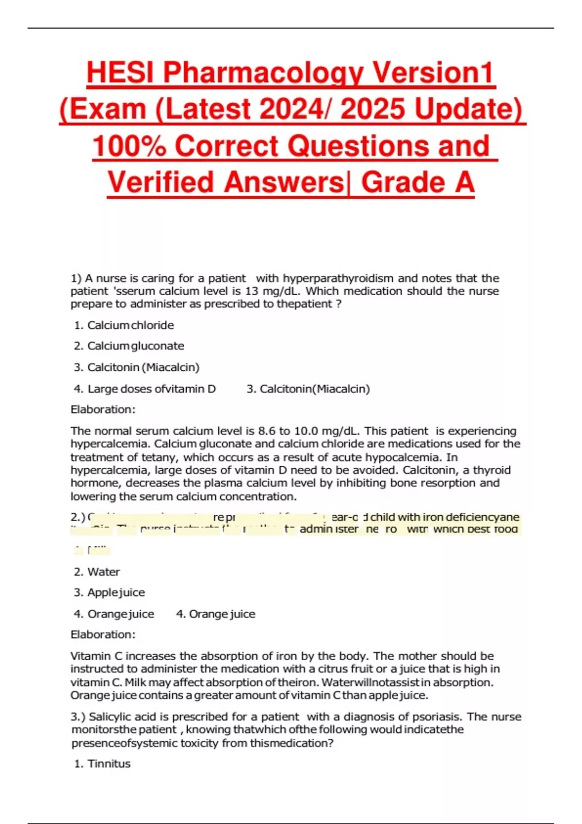 HESI Pharmacology Version1 (Exam (Latest 2024/ 2025 Update) 100% Correct Questions and Verified Answers| Grade A HESI Pharmacology Version1 (Exam (Latest 2024/ 2025 Update) 100% Correct Questions and Verified Answers| Grade A