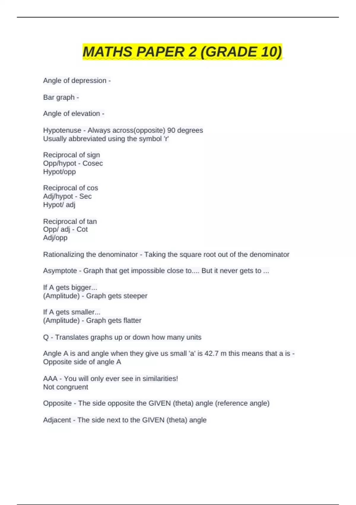 MATHS PAPER 2 (GRADE 10 STUDY GUIDE