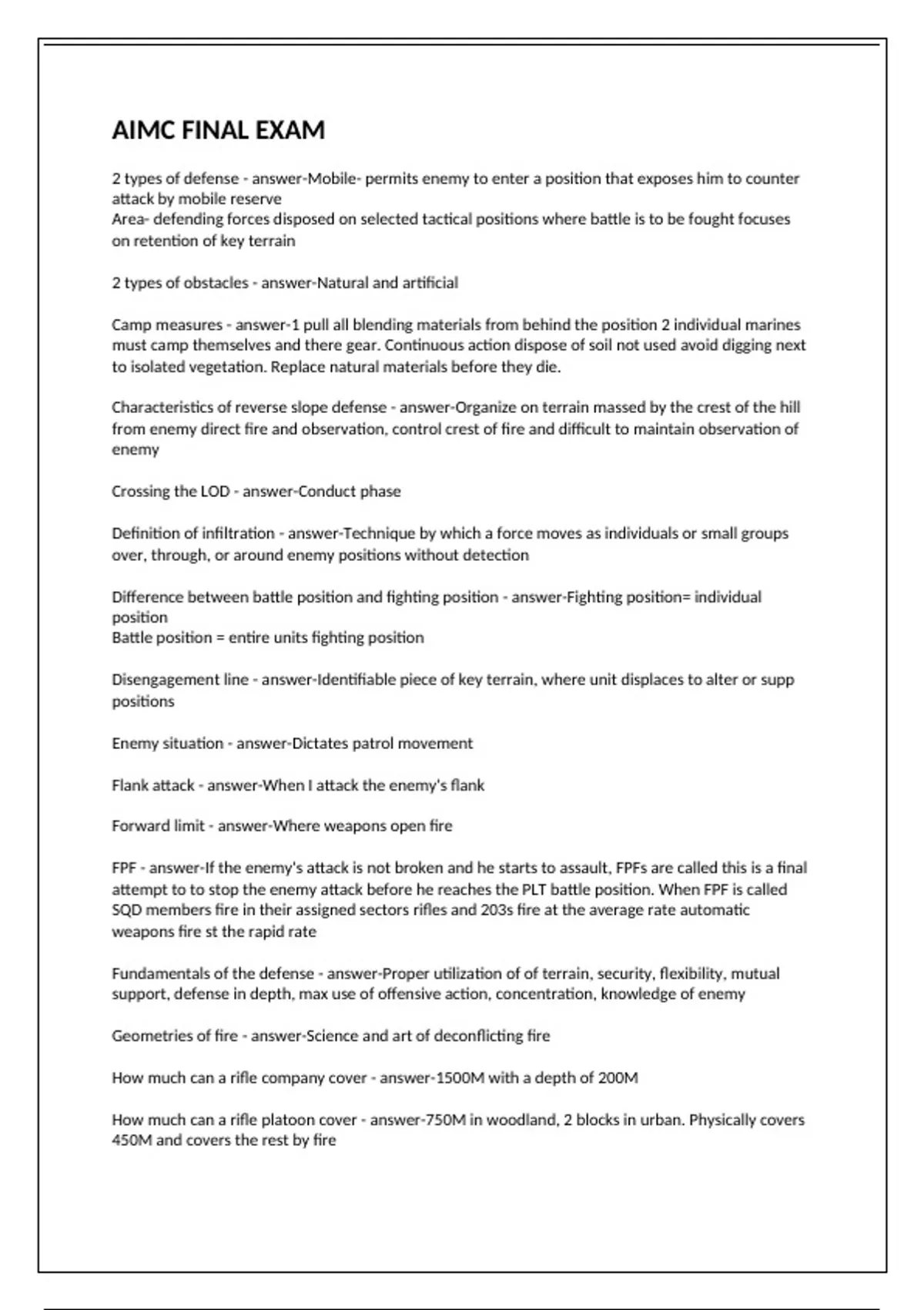 2 types of defense - answer-Mobile- permits enemy to enter a position that exposes him to counter attack by mobile reserve Area- defending forces disposed on selected tactical positions where battle is to be fought focuses on retention of key terrain 2 types of obstacles - answer-Natural and artificial Camp measures - answer-1 pull all blending materials from behind the position 2 individual marines must camp themselves and there gear. Continuous action dispose of soil not used avoid digging next to isolated vegetation. Replace natural materials before they die. Characteristics of reverse slope defense - answer-Organize on terrain massed by the crest of the hill from enemy direct fire and observation, control crest of fire and difficult to maintain observation of enemy Crossing the LOD - answer-Conduct phase Definition of infiltration - answer-Technique by which a force moves as individuals or small groups over, through, or around enemy positions without detection Difference between battle position and fighting position - answer-Fighting position= individual position Battle position = entire units fighting position Disengagement line - answer-Identifiable piece of key terrain, where unit displaces to alter or supp positions Enemy situation - answer-Dictates patrol movement Flank attack - answer-When I attack the enemy's flank Forward limit - answer-Where weapons open fire FPF - answer-If the enemy's attack is not broken and he starts to assault, FPFs are called this is a final attempt to to stop the enemy attack before he reaches the PLT battle position. When FPF is called SQD members fire in their assigned sectors rifles and 203s fire at the average rate automatic weapons fire st the rapid rate Fundamentals of the defense - answer-Proper utilization of of terrain, security, flexibility, mutual support, defense in depth, max use of offensive action, concentration, knowledge of enemy Geometries of fire - answer-Science and art of deconflicting fire How much can a rifle company cover - answer-1500M with a depth of 200M How much can a rifle platoon cover - answer-750M in woodland, 2 blocks in urban. Physically covers 450M and covers the rest by fire Linear defense - answer-Most common type of area defense, requires a maximum employment of forces forward with a small reserve, and has a strong mutual support between forward units, limited depth and minimum flexibility. Has interlocking and overlapping observation and fields of fire along the FEBA to preclude penetration. The bulk of the maneuver units is forward to gain interlocking small arms fire within and between companies. The Amin effort is assigned to the most likely avenue of enemy approach. The reserve is usually small and used to reinforce forward units to give depth to the defense to block penetrations or to counterattack to regain key terrain. If available, tanks form the basis of a counterattack force. Movement to contact units - answer-Point of advanced guard, rear point, point of flank guard, flank patrol, main body Obscuration/deception - answer-Can be used to to deceive Perimeter defense - answer-This defense disposes a unit to meet an attack from all directions simultaneously. It is a suitable defense for use by the rifle company. The rifle company prepares a perimeter defense when there are no friendly units adjacent to it. A perimeter defense may be used in a reserve position, in an assembly area or PB, on a semi-independent, operation, during re-supply, or when the company is isolated. Reserve plt has a primary function of blocking and counter attacking penetrations Phases of offensive combat - answer-Preparation conduct and exploration Preferred way to move through an urban area - answer-Double column Principal of war - answer-MOOSEMUSS Mass Objective Offense Security economy of forces Maneuver Unity of command Surprise Simplicity Principals of clearing fields of fire - answer-Don't excessively clear, start near your position and work towards limit of effective small arms fire, leave thin natural screen, remove lower branches, remove thin dense brush, cut weeds only when they block your view, move cut brush to position where it won't conceal enemy or expose your position, cut or burn grain crops hay fields or tall grass if necessary. Ensure overhead clearance for 203 Priorities of fire for automatic weapons - answer-Enemy automatic weapons, rocket teams and other crew served weapons Purpose of breach team - answer-Proof and exploit Purpose of night patrols - answer-Gain surprise, maintain pressure, to exploit success of daylight operations, seize terrain for subsequent operations, avoid heavy losses by using the concealment of darkness, compensate for inferior combat power. Purpose of obstacles - answer-Stops enemy entry into position, delays enemy approach, canalizes enemy, forces enemy troops to deploy prematurly Purpose of the defense - answer-To retain or control terrain gain time economize forces to allow the the concentration of forces else where and to develop more favorable conditions for offensive actions Relief in place - answer-A unit is replaced by an incoming unit who assumes responsibility for mission of relived unit Reverse slope - answer-An alternative to defending on the forward slope of a hill or a ridge is to defend of a reverse slope. In such a defense, the company is organized on the portion of a terrain feature that is masked by the crest of a hill from enemy direct fire and ground observation. Although some units and weapons may be positioned on forward edge of slope, the crest, or the counter slope(a forward slope of a hill to the rear of the reverse slope) most of them are on the reverse slope. The key to this defense is control of the crest by fire. Security patrol - answer-Gain info disorganize deceive and delay Sequence of defense - answer-Enemy predatory bombardment, opening fire and fire control, FPF, enemy reaches sqd fighting position Structural classification - answer-Framed/Framess Two t