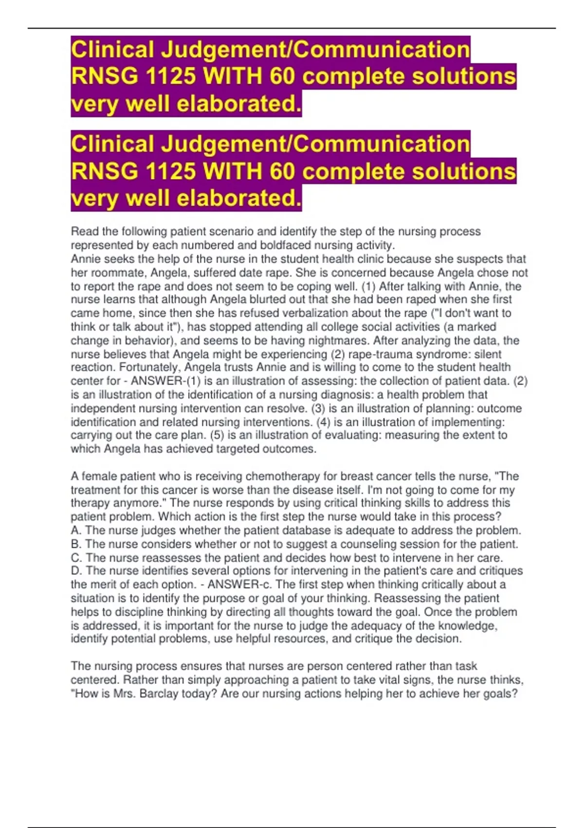 Clinical Judgement/Communication RNSG 1125 WITH 60 complete solutions very well elaborated.