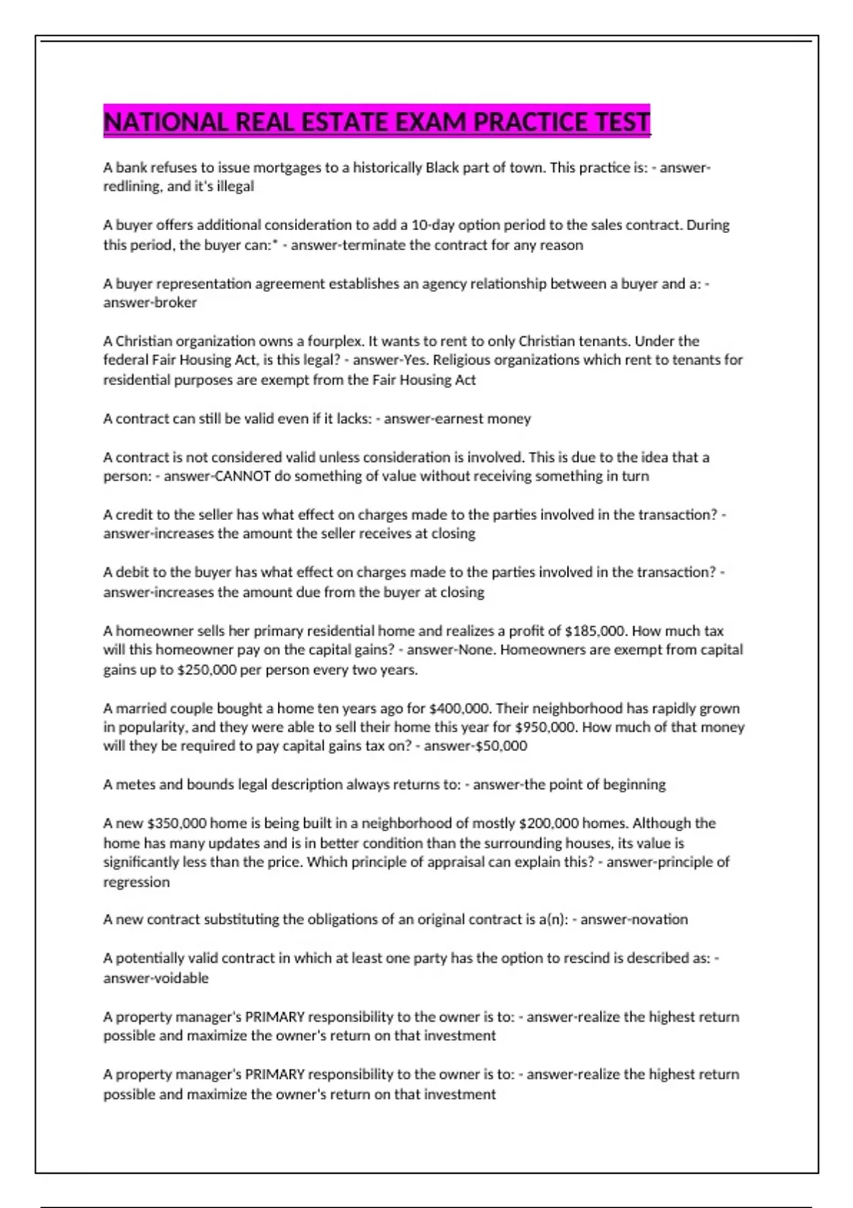 A bank refuses to issue mortgages to a historically Black part of town. This practice is: - answer-redlining, and it's illegal A buyer offers additional consideration to add a 10-day option period to the sales contract. During this period, the buyer can:* - answer-terminate the contract for any reason A buyer representation agreement establishes an agency relationship between a buyer and a: - answer-broker A Christian organization owns a fourplex. It wants to rent to only Christian tenants. Under the federal Fair Housing Act, is this legal? - answer-Yes. Religious organizations which rent to tenants for residential purposes are exempt from the Fair Housing Act A contract can still be valid even if it lacks: - answer-earnest money A contract is not considered valid unless consideration is involved. This is due to the idea that a person: - answer-CANNOT do something of value without receiving something in turn A credit to the seller has what effect on charges made to the parties involved in the transaction? - answer-increases the amount the seller receives at closing A debit to the buyer has what effect on charges made to the parties involved in the transaction? - answer-increases the amount due from the buyer at closing A homeowner sells her primary residential home and realizes a profit of $185,000. How much tax will this homeowner pay on the capital gains? - answer-None. Homeowners are exempt from capital gains up to $250,000 per person every two years. A married couple bought a home ten years ago for $400,000. Their neighborhood has rapidly grown in popularity, and they were able to sell their home this year for $950,000. How much of that money will they be required to pay capital gains tax on? - answer-$50,000 A metes and bounds legal description always returns to: - answer-the point of beginning A new $350,000 home is being built in a neighborhood of mostly $200,000 homes. Although the home has many updates and is in better condition than the surrounding houses, its value is significantly less than the price. Which principle of appraisal can explain this? - answer-principle of regression A new contract substituting the obligations of an original contract is a(n): - answer-novation A potentially valid contract in which at least one party has the option to rescind is described as: - answer-voidable A property manager's PRIMARY responsibility to the owner is to: - answer-realize the highest return possible and maximize the owner's return on that investment A property manager's PRIMARY responsibility to the owner is to: - answer-realize the highest return possible and maximize the owner's return on that investment A property owner has the right to tell other people that they cannot trespass on their property. What is this right called? - answer-right of exclusion A square bedroom measures 10 feet by 10 feet. What is the area of the room? - answer-100 square feet A valid sales contract stipulates that the seller must repair a hole in the roof before closing day. The seller failed to do so, which makes the seller guilty of: - answer-breach of contract All federally related loan programs require a property to have which of these? - answer-an appraisal Allie cannot depreciate her investment property for a tax deduction. What kind of property is it? - answer-undeveloped land An agent should present all offers to their client UNLESS:* - answer-the client explicitly instructs the agent not to present any offers below a certain amount in writing An alienation clause would require a borrower to: - answer-pay the mortgage debt in its entirety upon the property being sold An appraisal is required for all: - answer-federally related loan programs An appraisal report is a report from a: - answer-licensed appraiser that sums up a property's market value based on collected data An example of a voidable contract is a contract that: - answer-is made with one party who is not competent An executory contract is a contract that: - answer-has not yet been fully performed An investor has purchased a one-family home that they plan to rent as an investment. Which of these statements accurately describes how it can be depreciated? - answer-It can be depreciated over 27.5 years. An unmarried Texas couple purchased real estate together. How would the deed identify how they hold their interests if they specify they want them passed to the survivor in case of death? - answer-joint tenancy with rights of survivorship Arturo is buying a house for $400,000. He will be making a down payment of 5%. He already submitted a check for $2,000 as earnest money, which will be applied to the purchase. How much will Arturo need to pay on closing day? - answer-$18,000 Asbestos, an environmental hazard, is a mineral that has been used for many years as: - answer-insulation Ben manages an apartment complex that has an effective gross income of $100,000. Operating expenses were $60,000. What is the net operating income of the property? - answer-$40,000 Both parties involved in an agency agreement agree to end the agreement early. What is this called? - answer-mutual rescission Brenda and her husband are interested in buying a house that was constructed in 1971 that has all the original paint, windows, and flooring. What is required from the listing agent in this situation?* - answer-The agent needs to furnish the buyers with a pamphlet approved by the EPA concerning lead based paint prior to closing. Burt is buying a house for $100,000 and is making a 20% down payment. He is paying a 1-point origination fee to a mortgage lender, $500 for a new survey, and $800 for an environmental report. Based on this, before any prorations, how much cash will Burt have to bring to the closing? - answer-$22,100 CERCLA was passed in 1980 to: - answer-establish a Superfund to clean up uncontrolled hazardous waste sites and to respond to spills Condemnation is the act of seizing private property from citizens. What gives the government the right to do 
