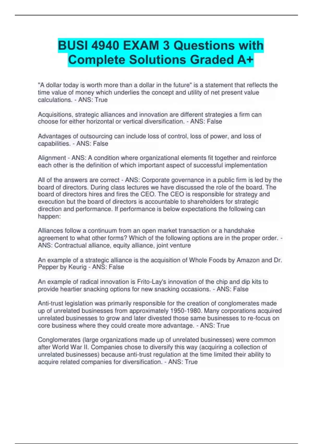 BUSI 4940 EXAM 3 Questions with Complete Solutions Graded A+